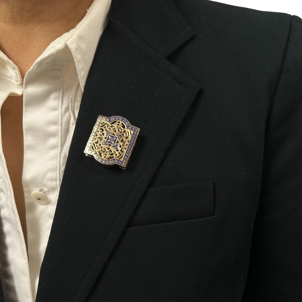 Exquisitely made vintage ornately woven 14k yellow gold tassel bracelet with dark blue enamel detailing. Center panel detaches and can be worn as a pendant, and with the hinged bail dropped down- as a brooch. This exceptional bracelet is essentially three pieces of jewellery in one!