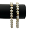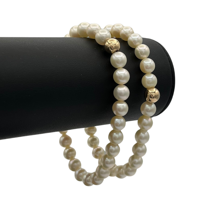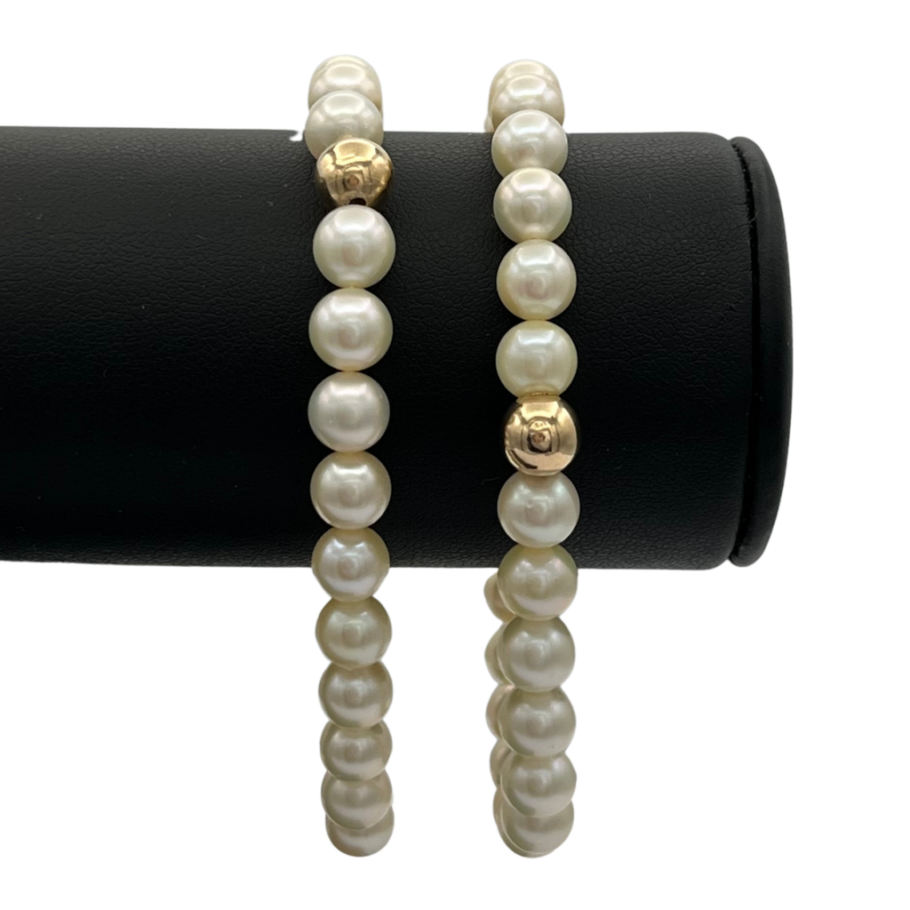 Estate Japanese cultured pearl elastic bracelets featuring a single round gold bead in 14k yellow gold. Bracelets are custom made for Daisy Exclusive by Monica Savage.