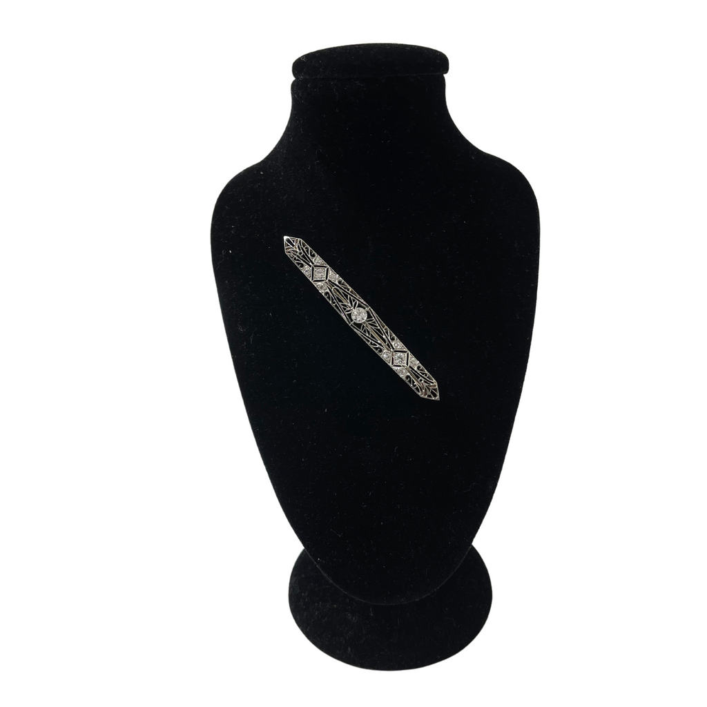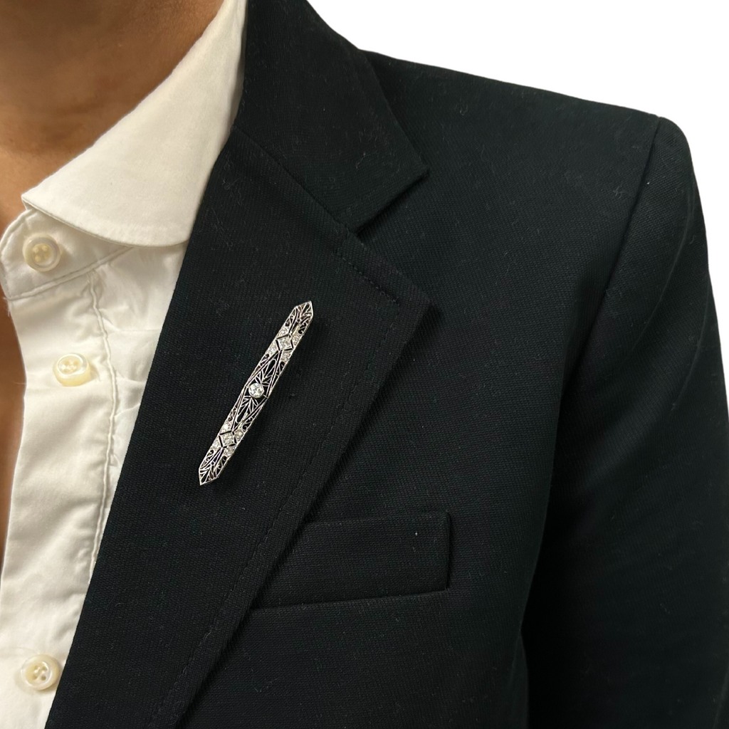 Stunning handmade Edwardian gallery set 0.55CT diamond and 18k white gold bar pin C.1910-1915. This pin is an excellent example of Edwardian craftsmanship displaying openwork and millegrain edging.