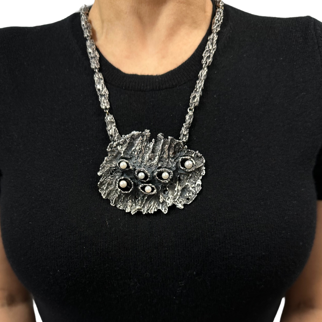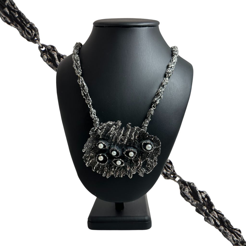 An exquisite example of Walter Schluep's artistry, this brutalist style brooch/pendant is adorned with lustrous pearls, and the perfect chain offers a fitting accompaniment to the brooch pin.