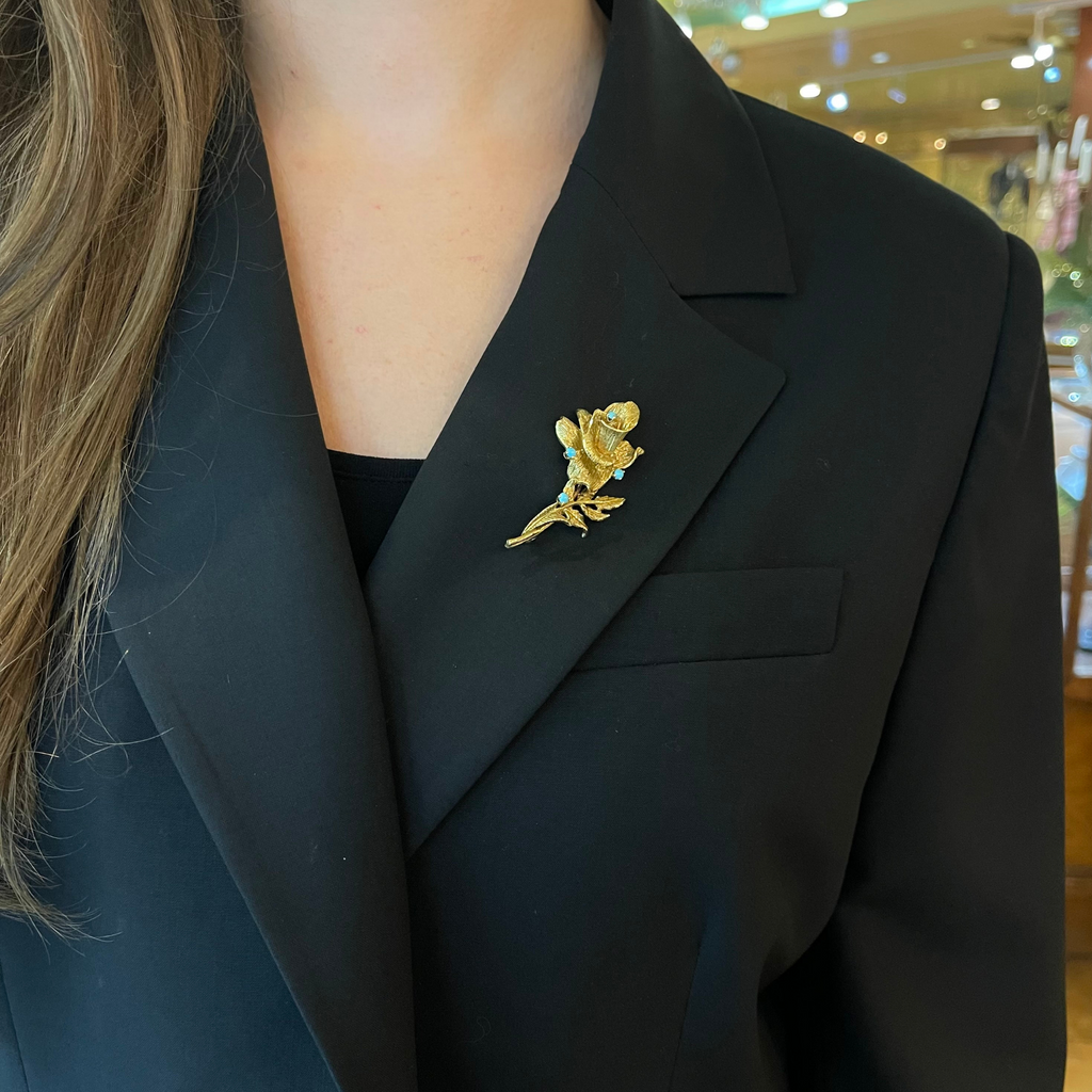 Elegant vintage flower brooch in 14k yellow gold adorned with turquoise stones.