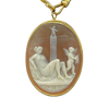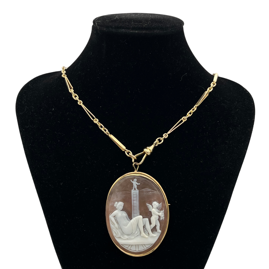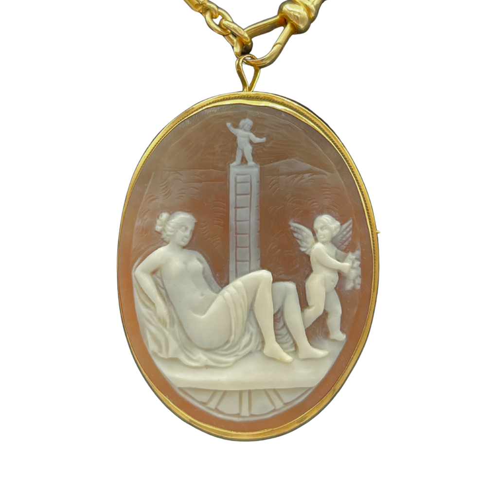 Masterfully hand-carved, this large oval shell cameo depicts a reclined female figure in light drapery, possibly Venus, and a winged cherub. In the background a third non-winged youth is depicted on top of a pedestal. The lowest register below the ground line features a lovely geometric engraving, utilizing the whole visual space of the cameo with texture and carved design. The brooch is bezel set in 18k yellow gold with a pin and closure, and a bail attachment for the cameo to be worn as a pendant.