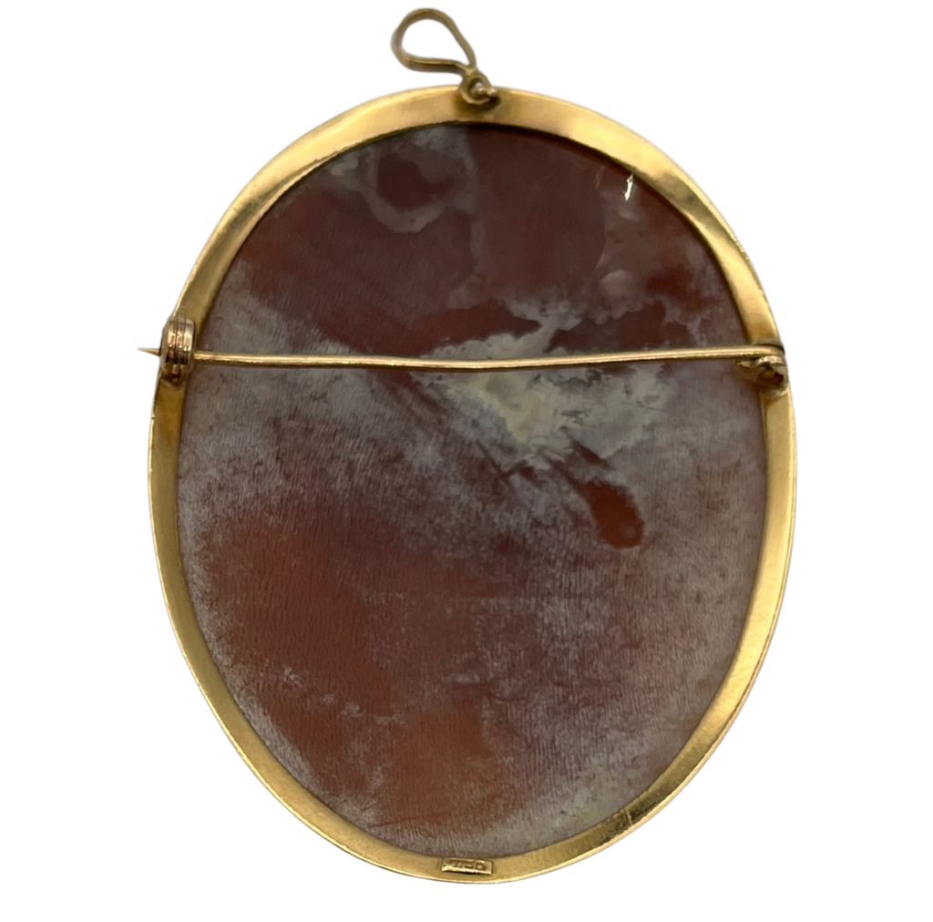 Shell Cameo: One (1) bezel set, hand carved oval shell cameo measuring approximately 49.5mm (L) x 38.8mm (W) x 2.8mm