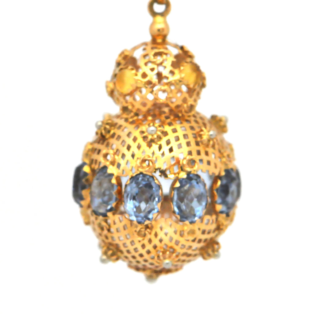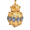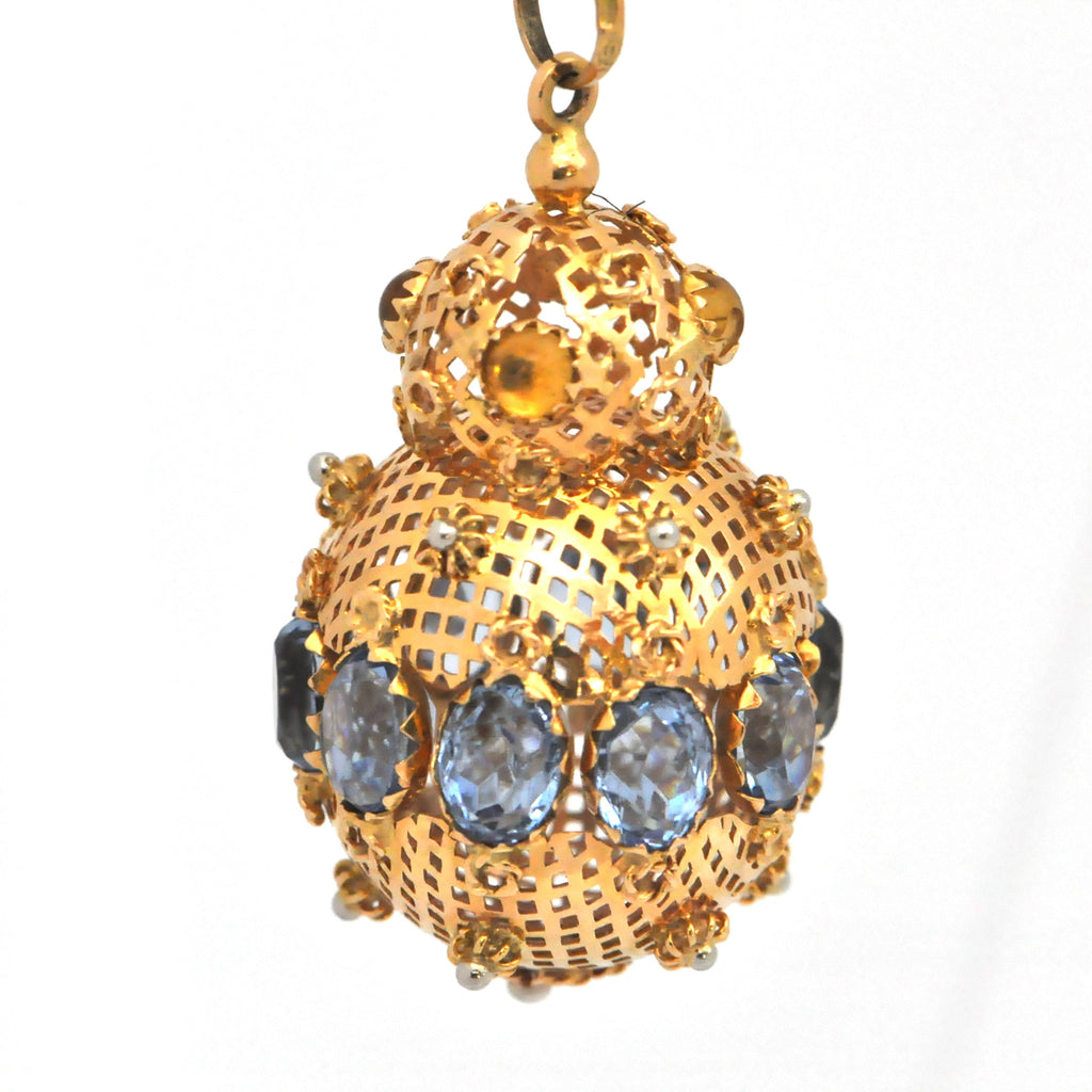 A beautiful symmetrical 18k gold charm with white gold decorative rounds. Blue faceted glass surrounds the piece and 4 yellow glass cabochons are placed around the top.