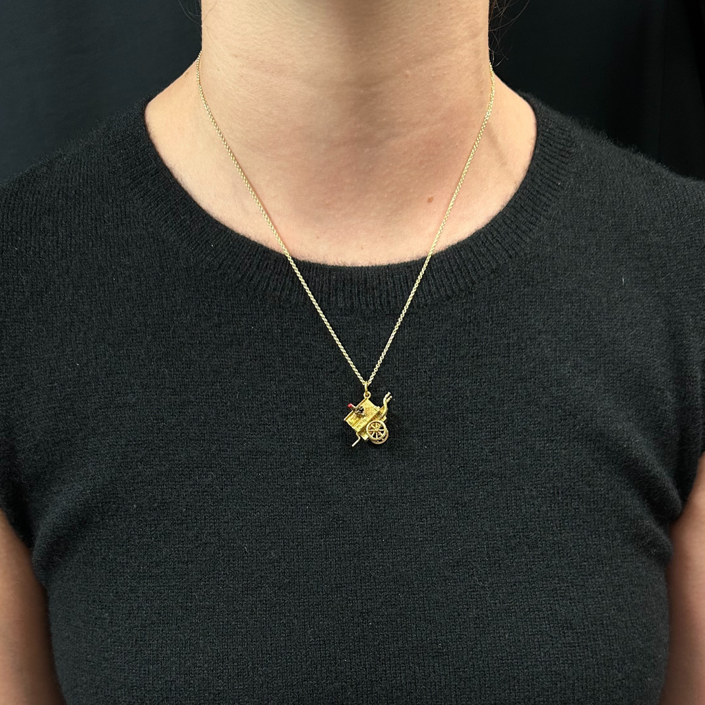 Adorable English miniature music cart with movable monkey in 9K yellow gold. Monkey dances when you turn the lever, and is decorated with enamel. The wheels also move.