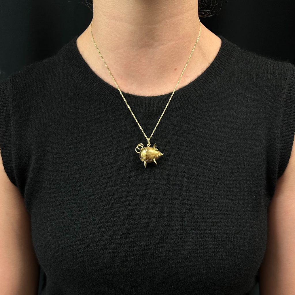 Delightful vintage textured 18k yellow gold pig charm. Features a platinum nose and turquoise colored glass eyes.