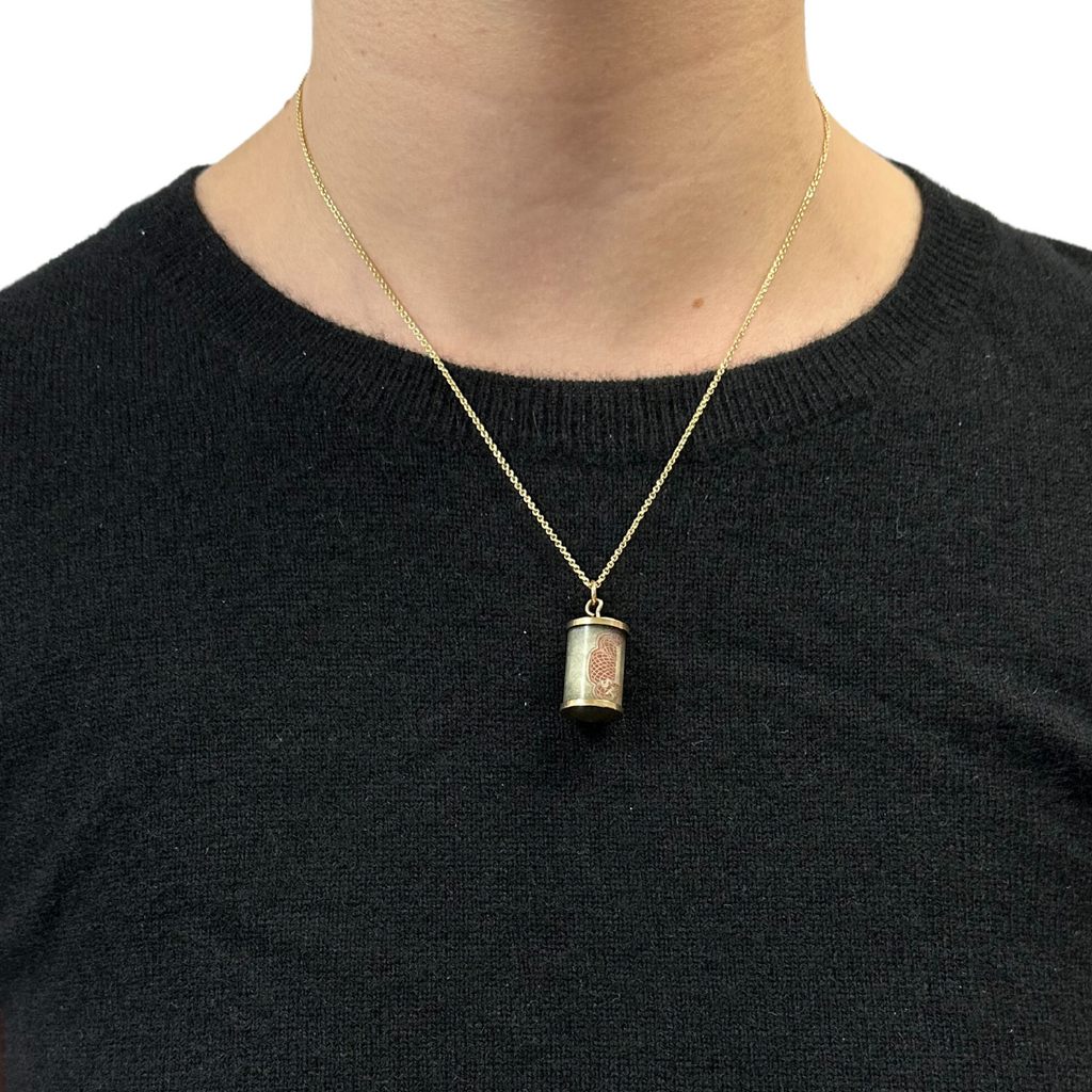 Vintage 9K yellow gold case with rolled up shilling charm. In excellent condition.