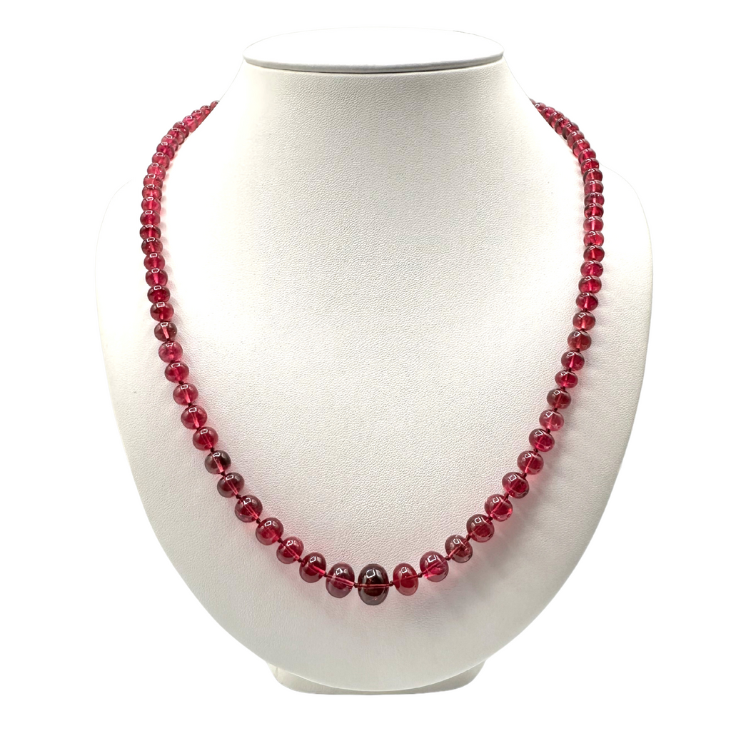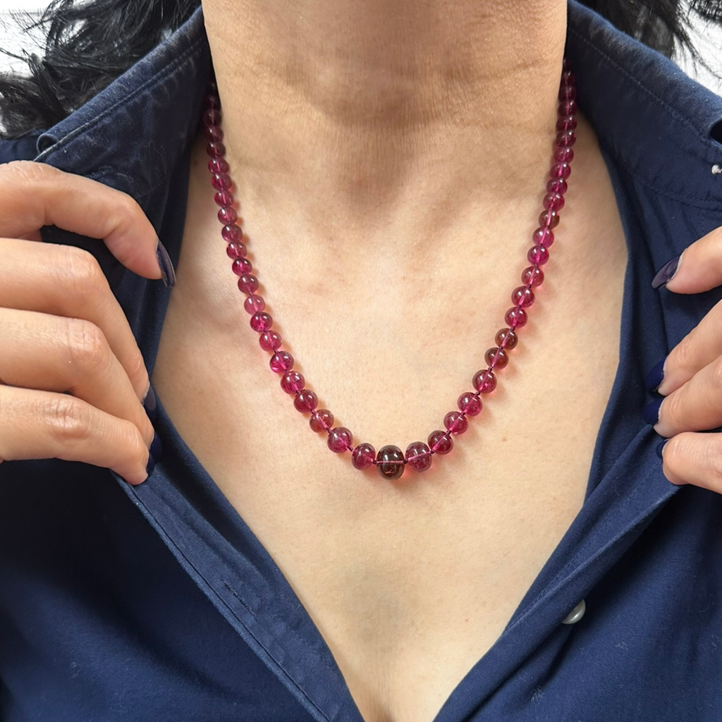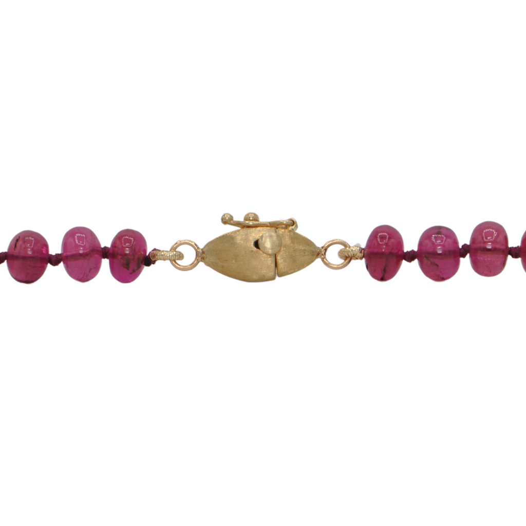 Exceptional strand of deep pink tourmaline beads that attach with a 14k yellow gold push clasp.