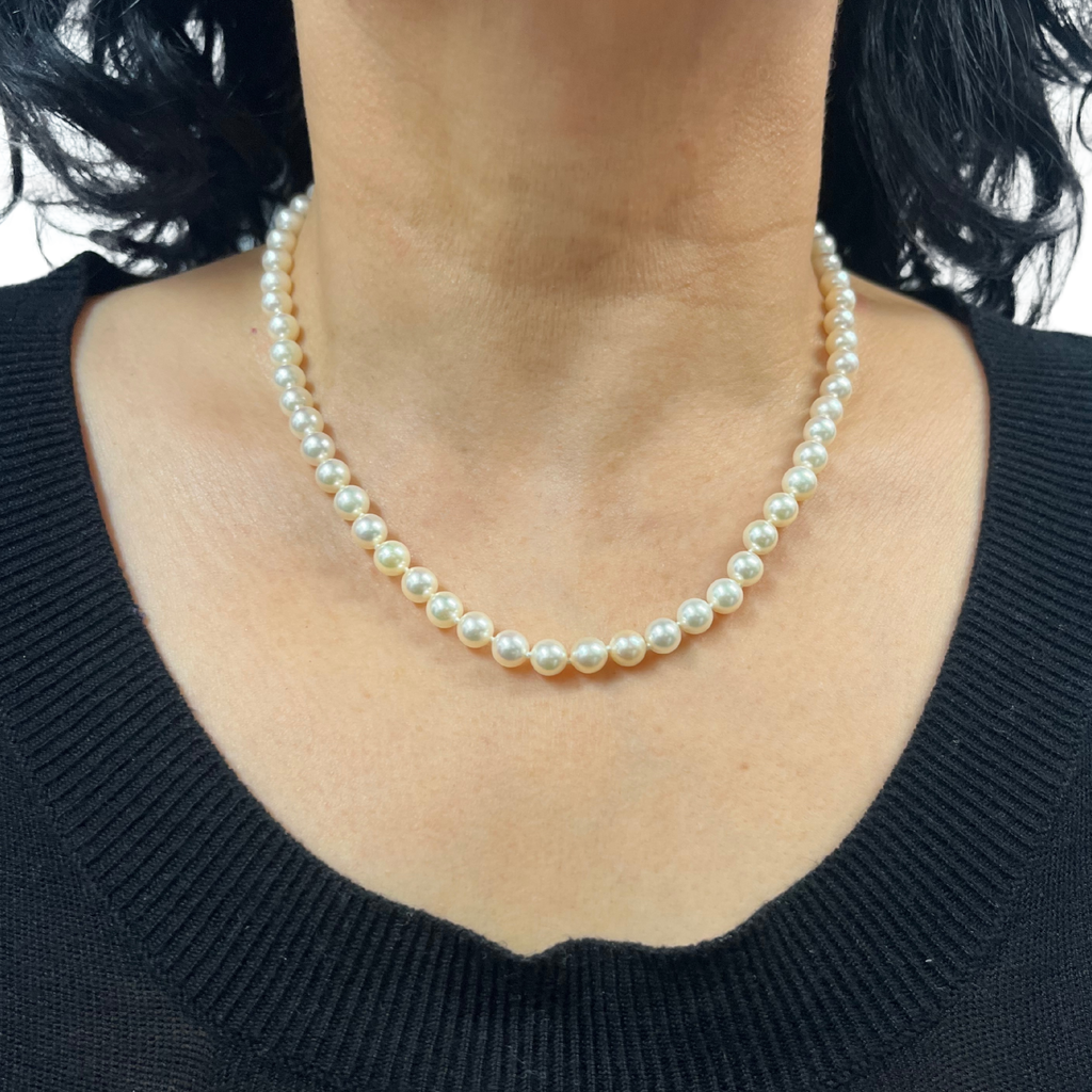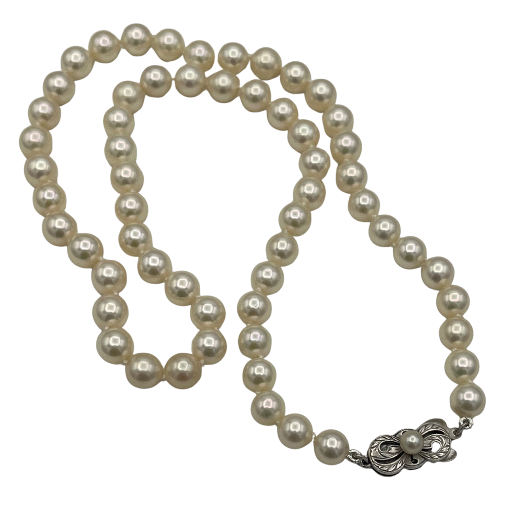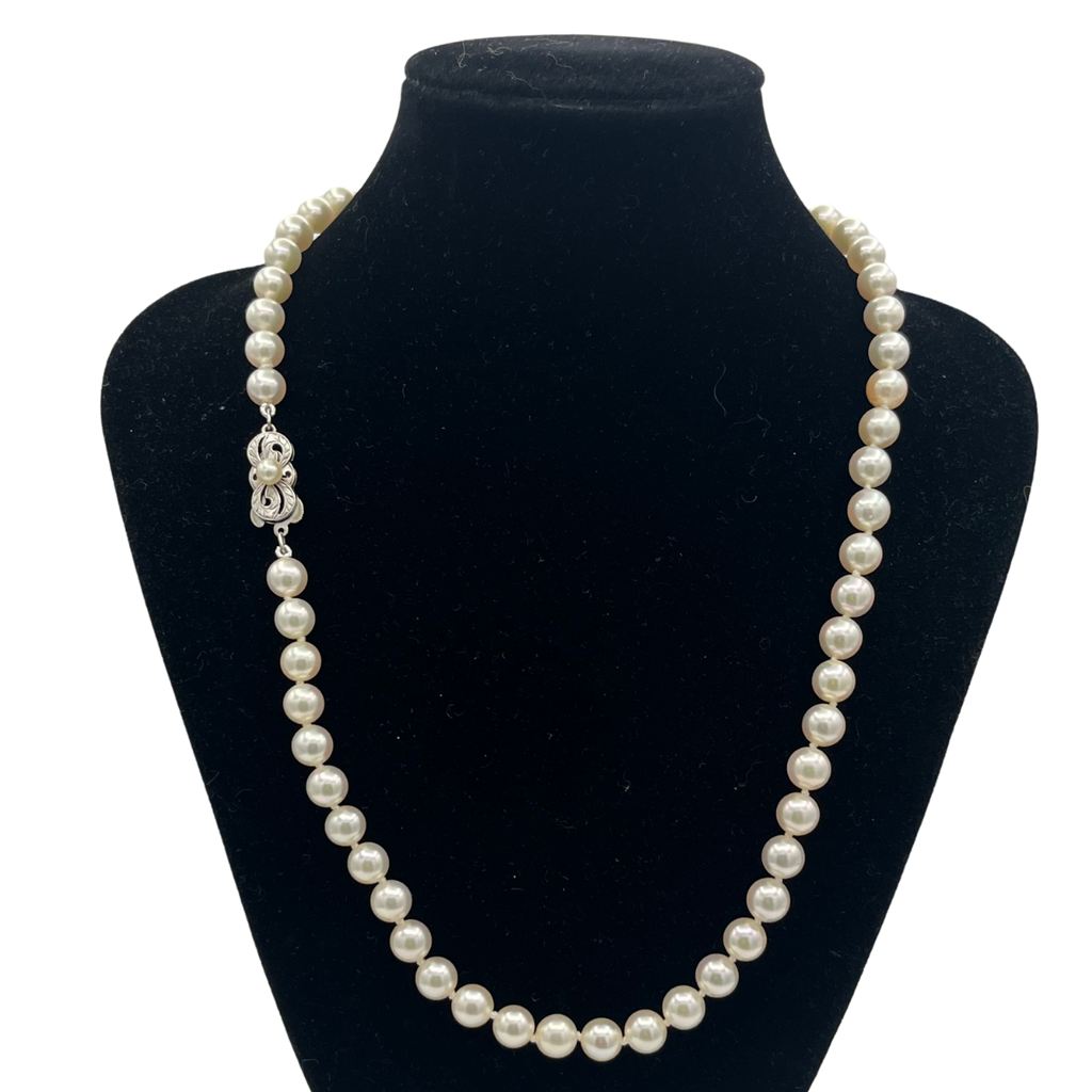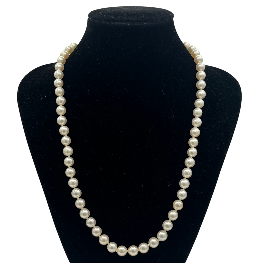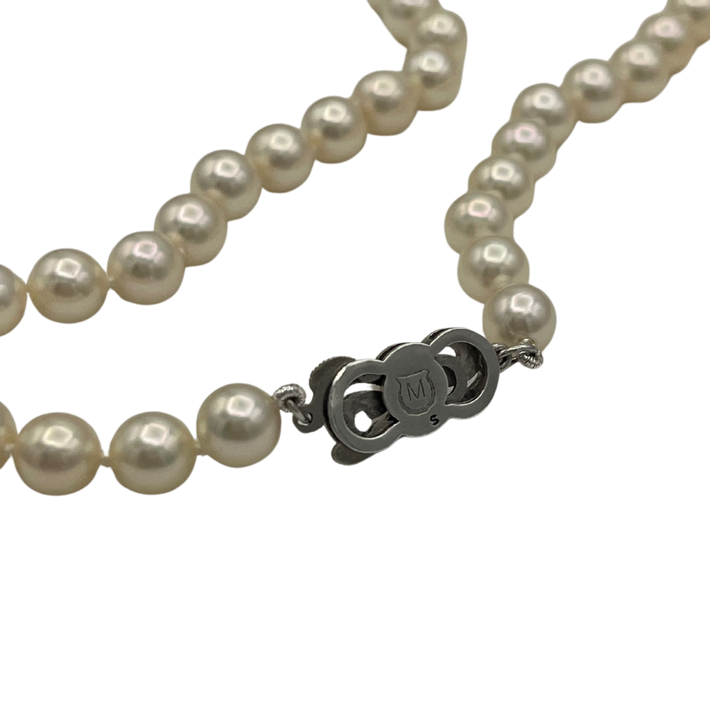 Signed Mikimoto 18" single strand Japanese cultured pearl necklace with a sterling silver and single pearl clasp.