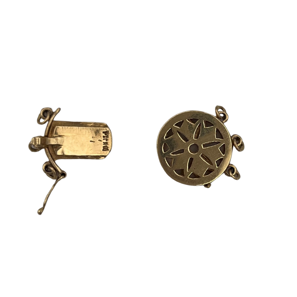 Elegant vintage 14k yellow gold round three-strand push clasp with a figure eight safety lock. Clasp features open work in floral-esq design. This lovely clasp would be perfect for a personal project.