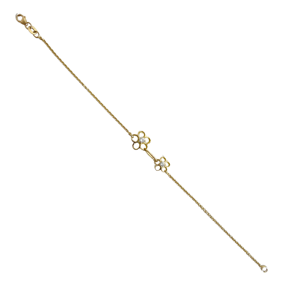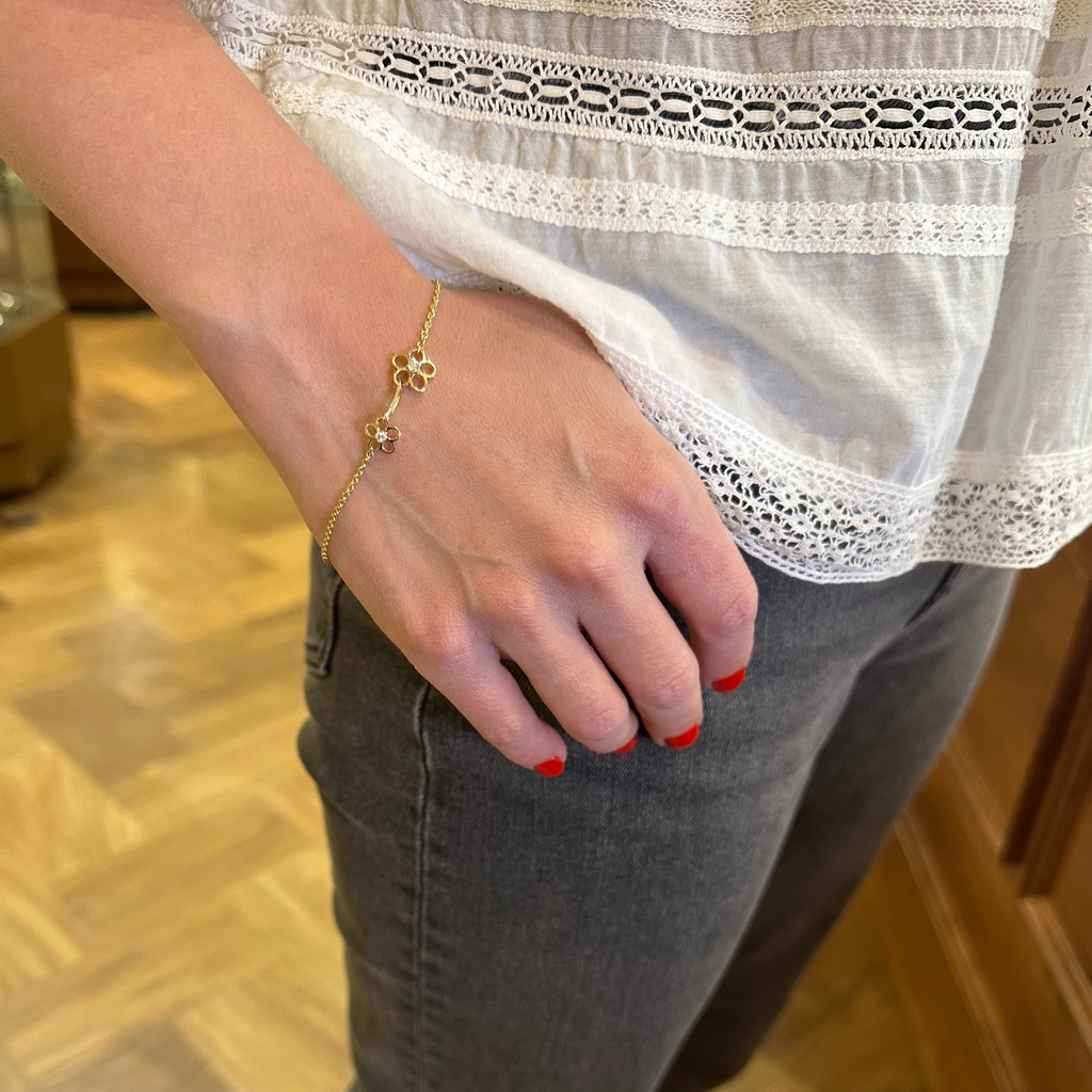 Our namesake collection would not be complete without this lovely 18k rose gold tiffany link bracelet with two daisy stations embellished with glimmering diamonds.