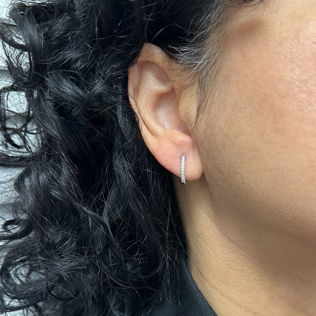 Elegant mini 18k white gold and diamond oval huggie hoop earrings. Custom-made by, Monica Savage for Daisy Exclusive. These huggies are perfect alone or with one of our enhancers. These earrings are available in either yellow, white, or rose gold.