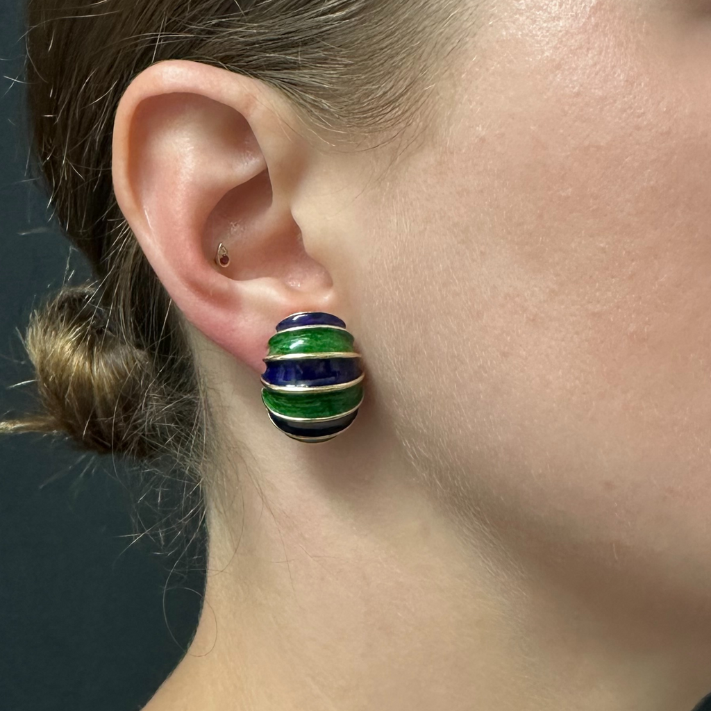 Lovely pair of ridged shrimp style clip-on earrings with alternating blue and green enamel work.  Posts can be added at no extra charge.