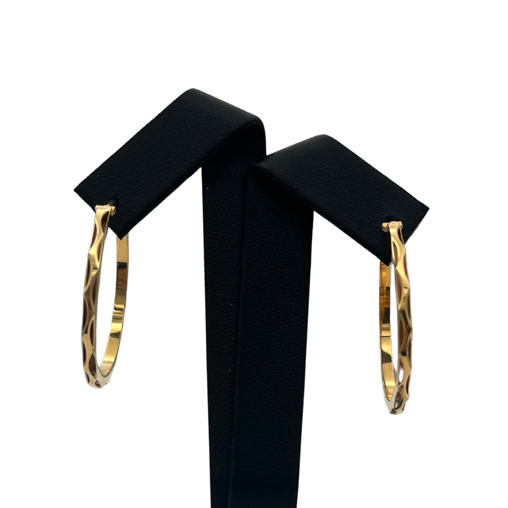 Vintage French 18k yellow gold hoop earrings with a cut-out motif on the exterior surface.