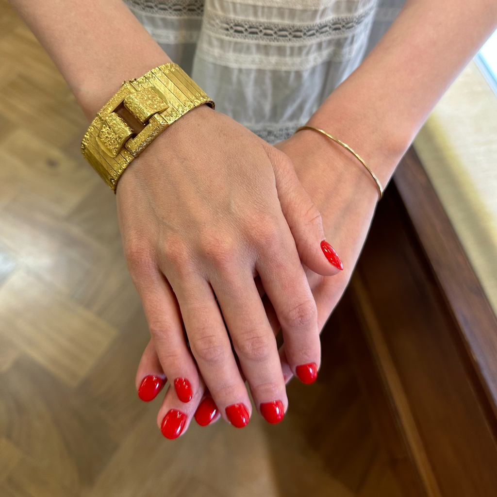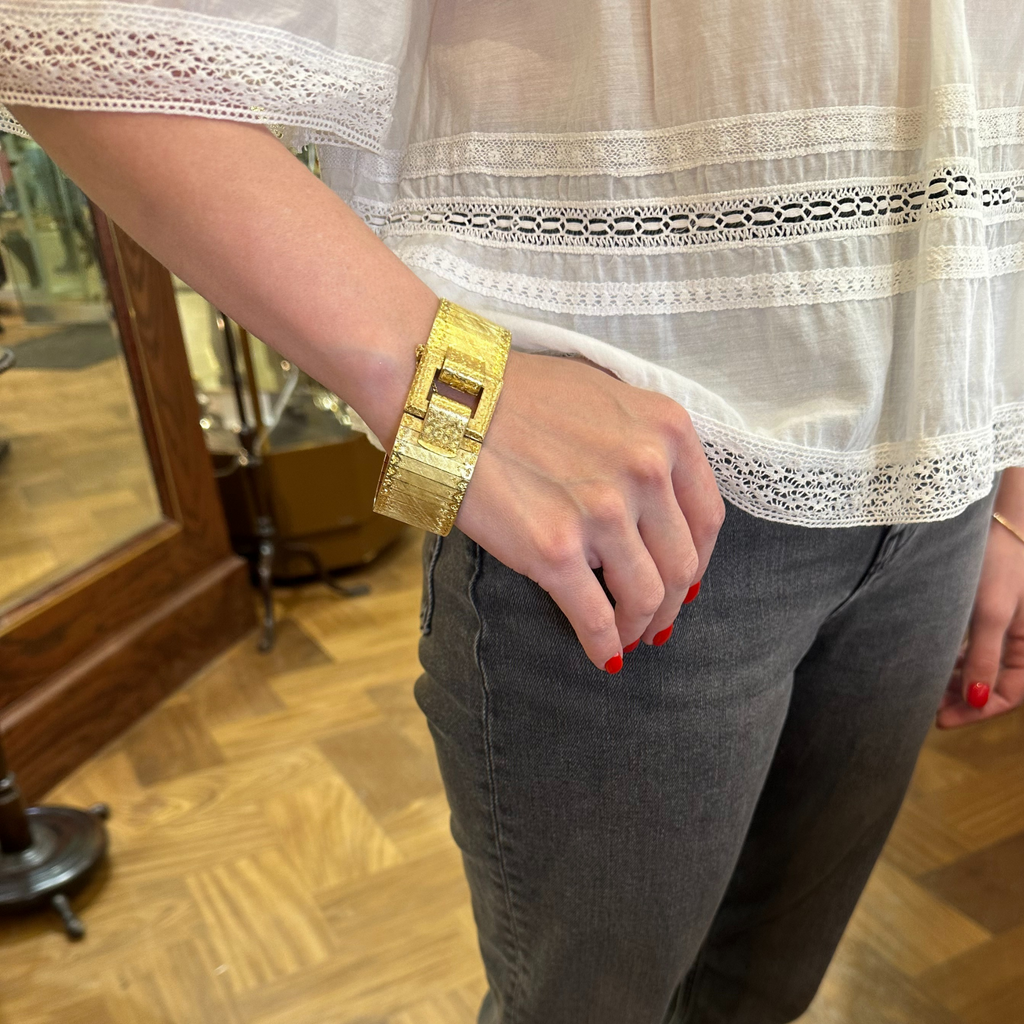 Estate Vintage Italian Wide Cuff Textured and Engraved 18k Gold Buckle Bracelet