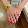An exceptional example of Italian goldsmith excellence this 18k yellow gold cuff bracelet not only features a brush finish on the flexible rectangular links but engraving throughout. This bracelet attaches with a large buckle clasp and a 1 3/8 inch safety chain.
