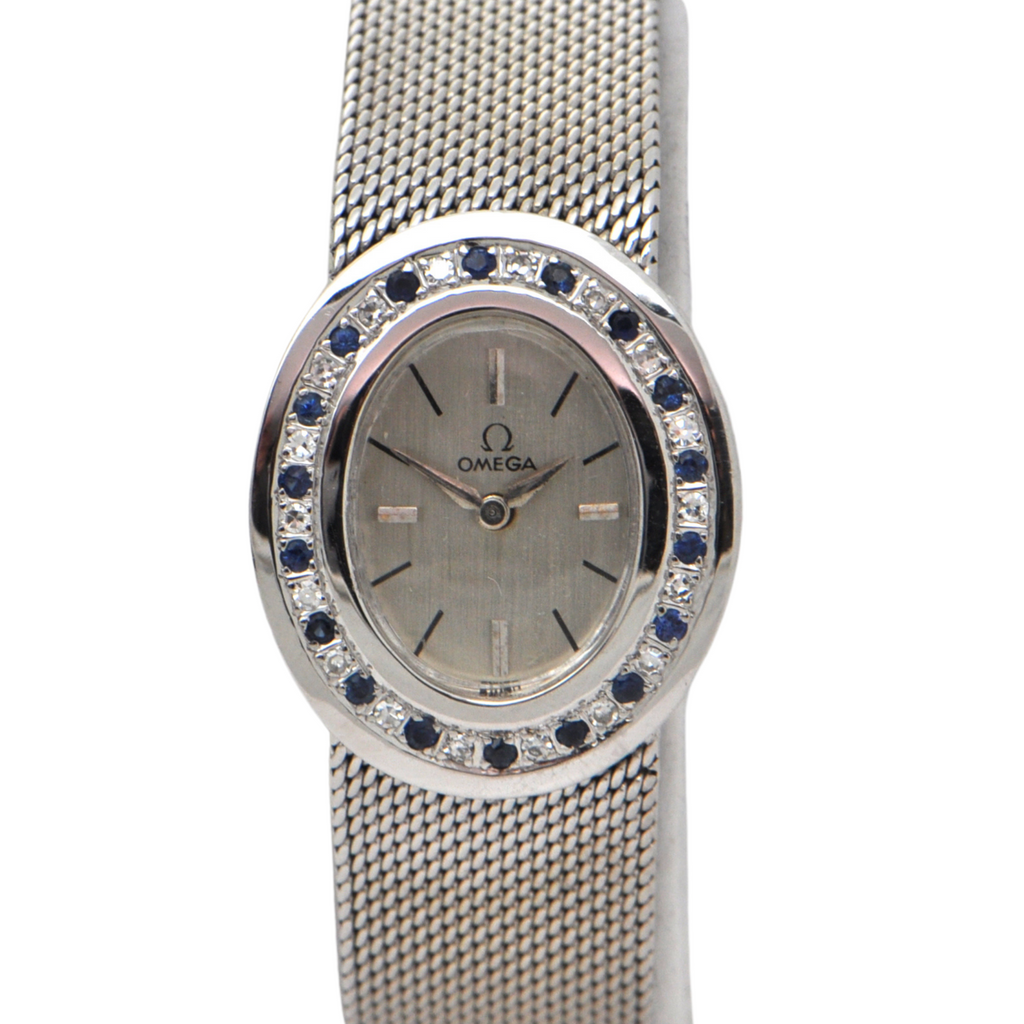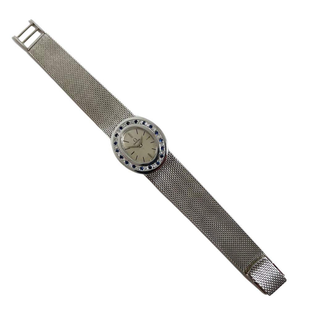 Elegant vintage Omega 18k white gold watch with a bezel accented in diamonds and sapphires c.1960's. Band is tightly woven shark mesh and attaches with a jewelry fold over clasp.