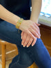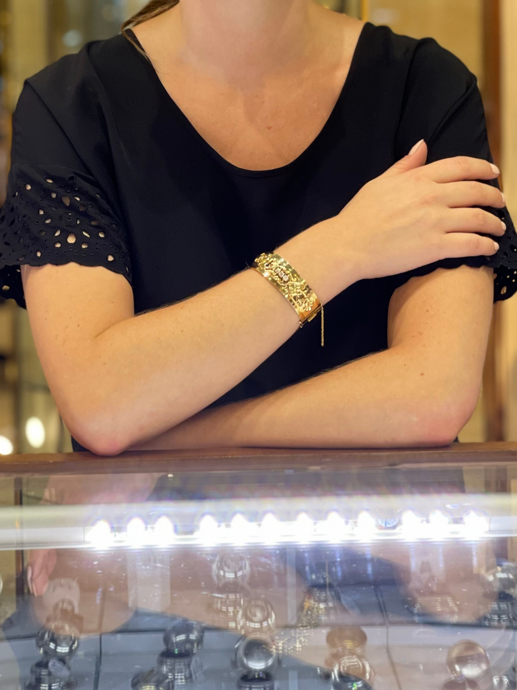 Fabulous retro French rose gold hinged cuff adorned with the sparkling round brilliant cut diamonds. Front of the cuff features scroll work en relief. Bracelet attaches with push clasp and has both a safety chain and figure eight safety lock.