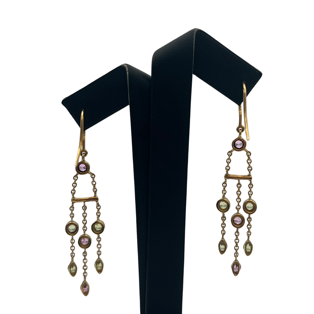 Lovely vintage Tiffany & Co. 18k yellow gold chandelier earrings with pink sapphires and peridot stones set on lengths of 1.3mm chain.