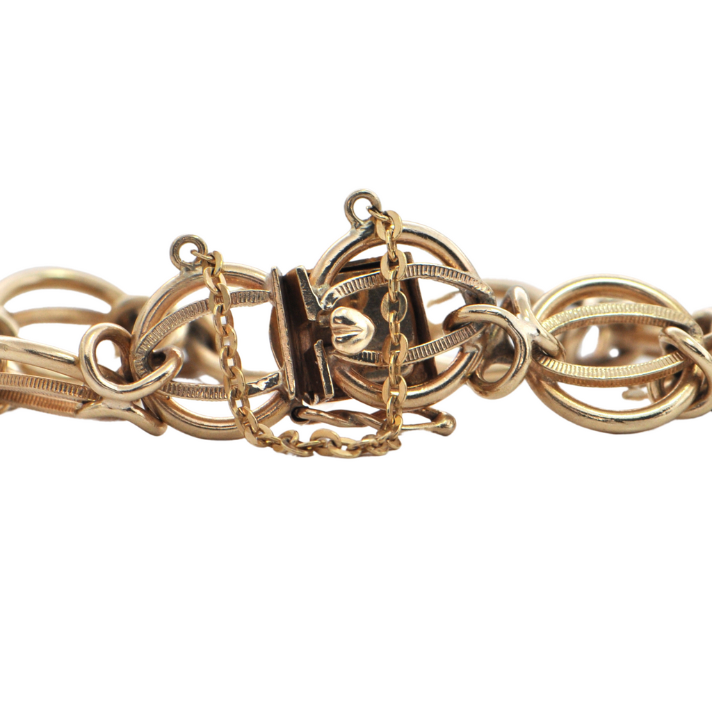 Elegant vintage 14k yellow gold fancy round and oval link bracelet featuring both a high polish and textured finish. Bracelet attaches with a push clasp and has a figure eight safety lock and safety chain.