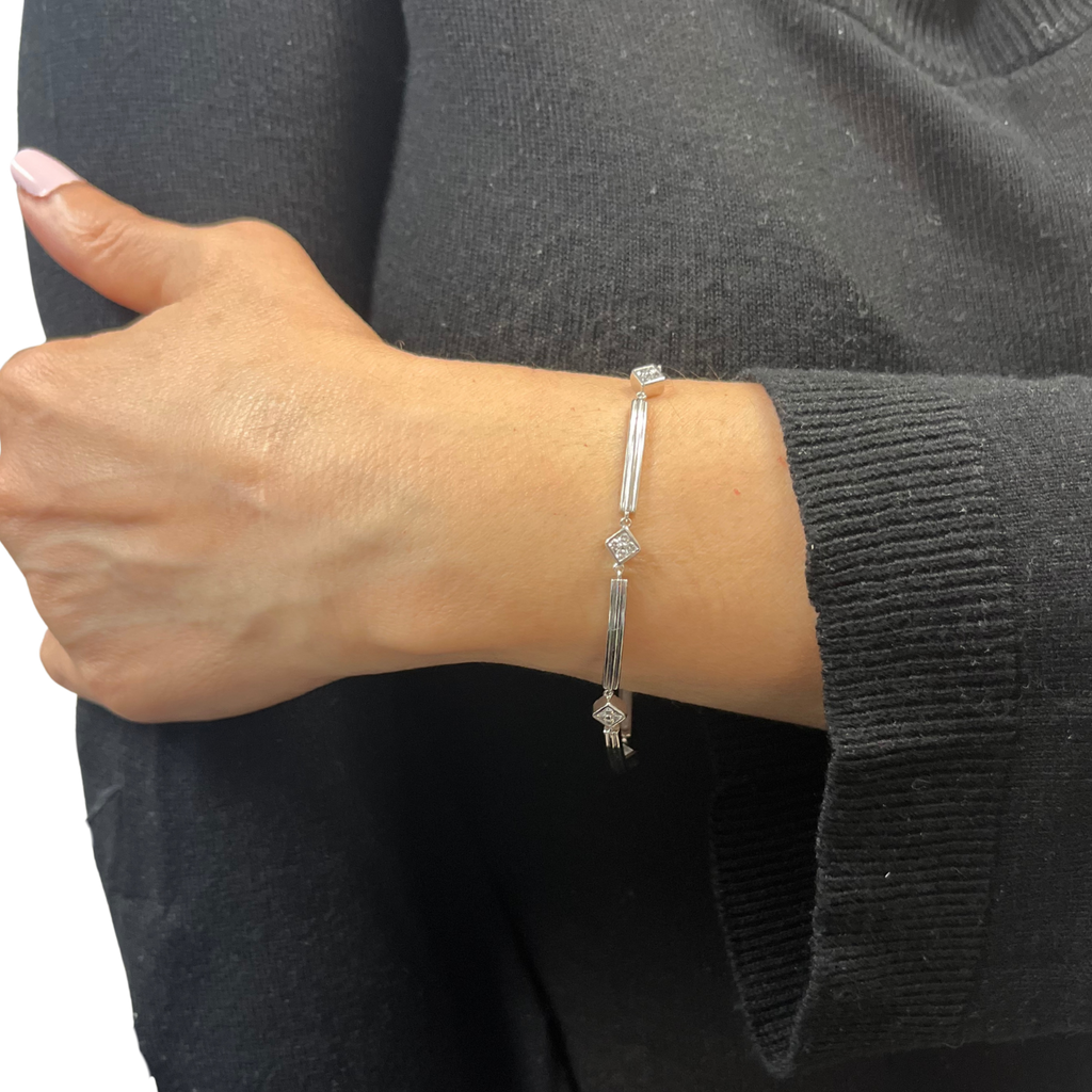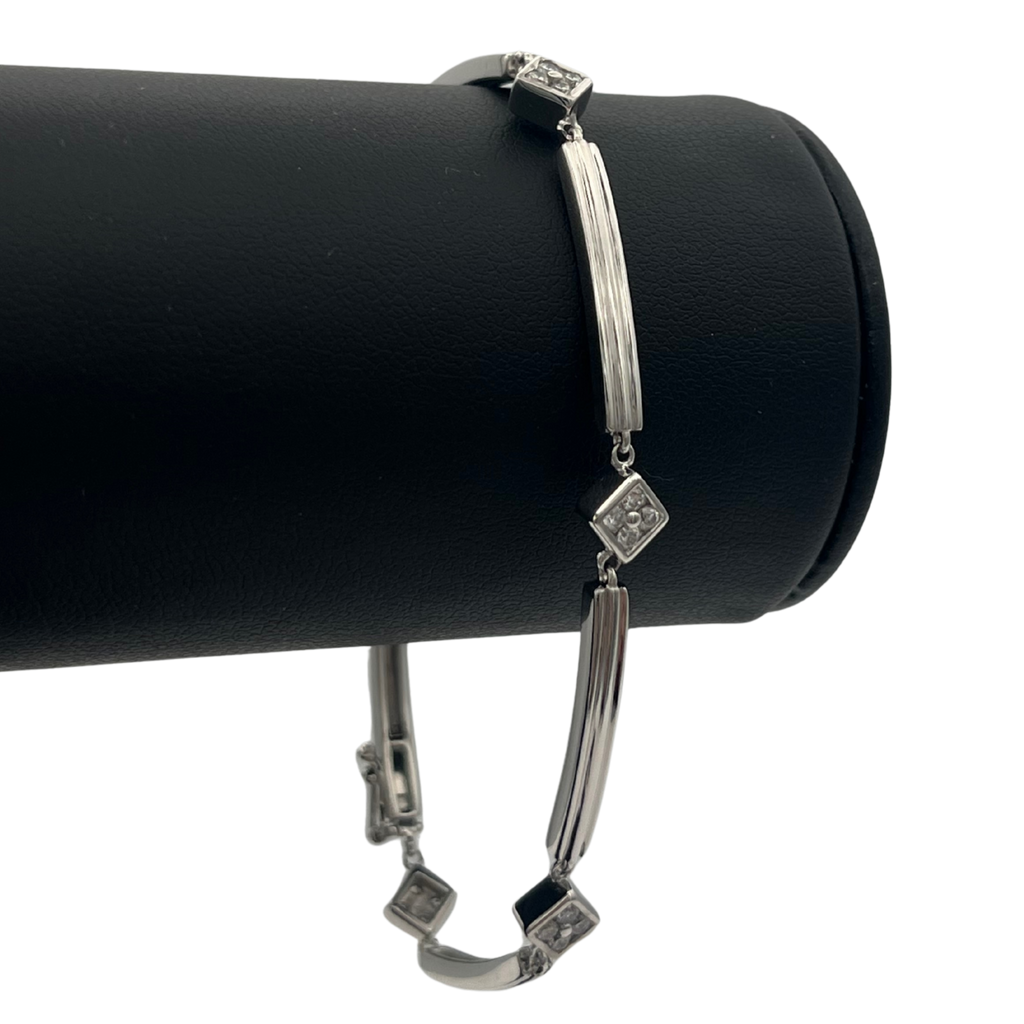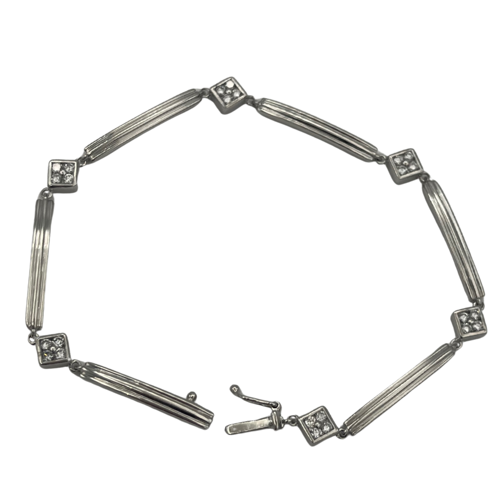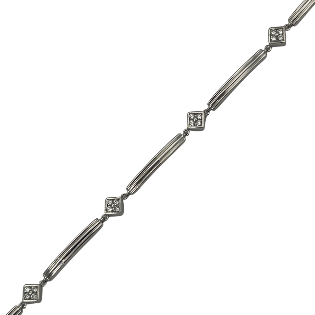 Lovely vintage station bracelet made up of alternating bar links and diamonds pavé set in a square motif. Bracelet fastens with a push clasp with a figure eight safety lock.