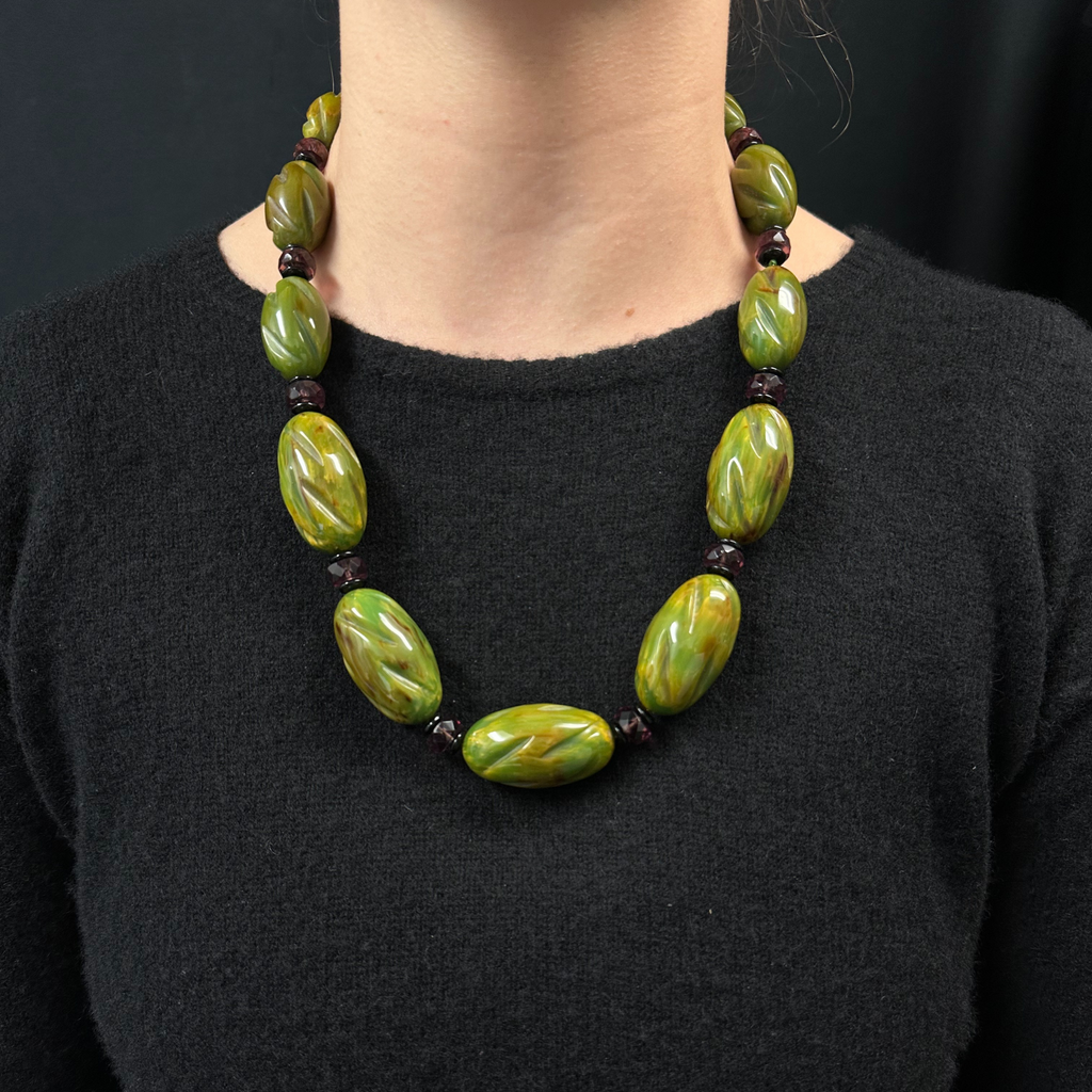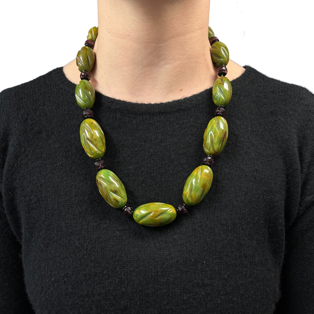 This fabulous necklace is comprised of alternating graduated oval carved marbled spinach green Bakelite beads, faceted amethyst rondels and black glass beads.