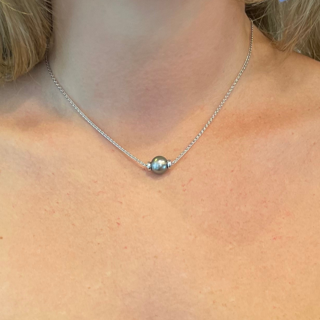 Lovely fully drilled Tahitian pearl floating delicately on a 18k white gold wheat link chain.