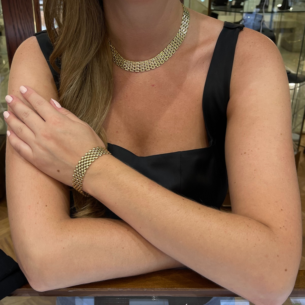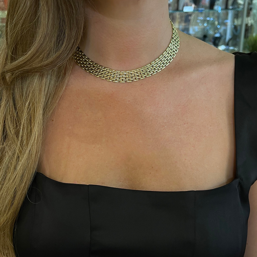 Classy and sophisticated Italian flexible 14k yellow gold panther link necklace measuring 16 inches in length. This necklace attaches with a push clasp.