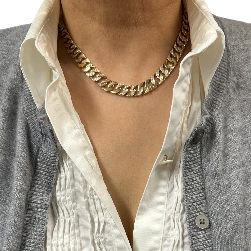 Sleek and sophisticated solid, 18k yellow gold high polish flat curb link necklace. Alternating links glitter brightly with an impressive 432 pavé set near-colorless diamonds. Necklace attaches with a matching link clasp and is secured with a safety eight lock.
