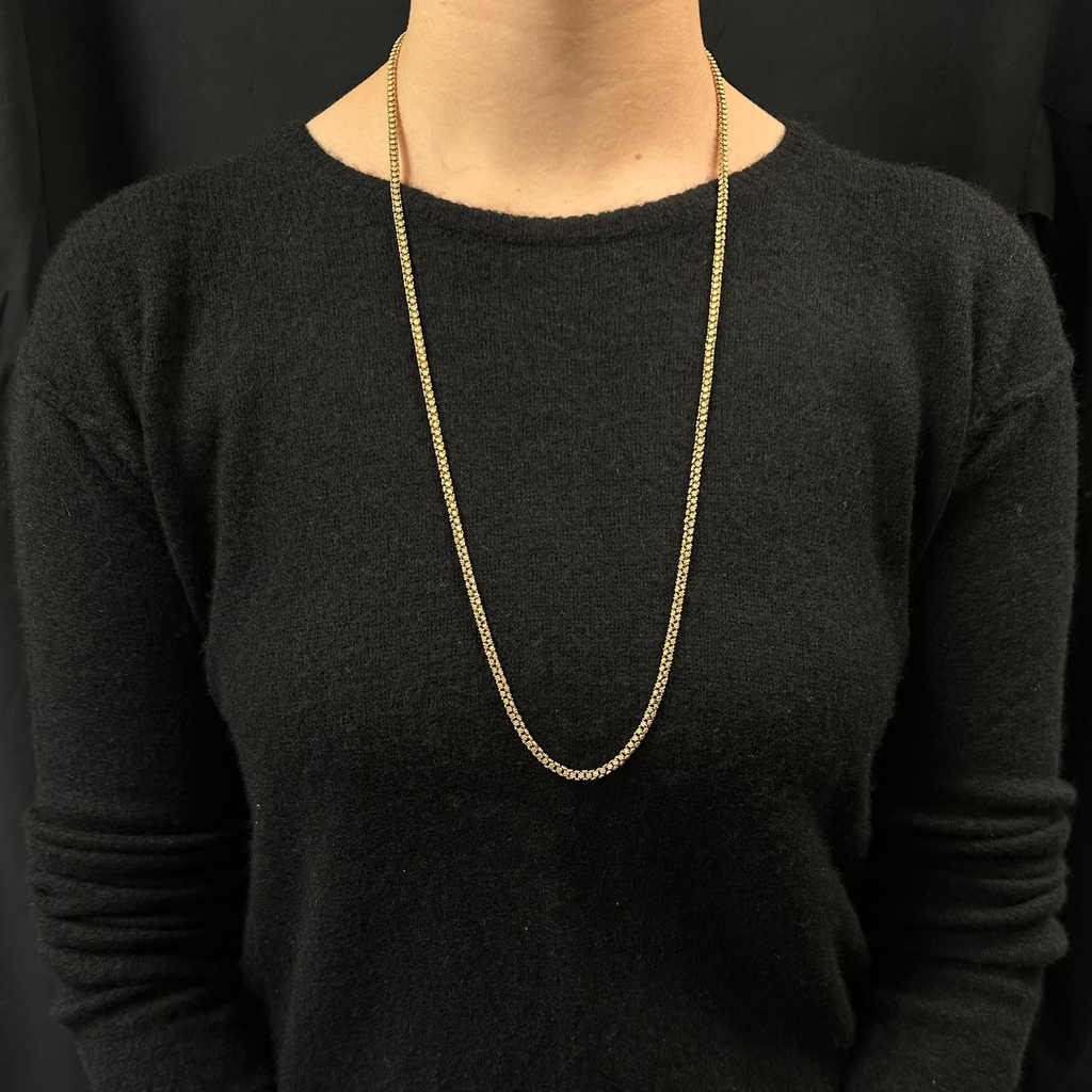 Exceptional 18k rose gold flexible rosette link necklace measuring 30 inches in length. The push clasp is beautifully decorated with matching rosettes and has two figure eight safety locks.