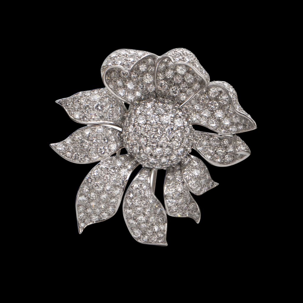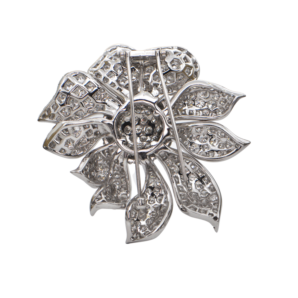 A spectacular statement piece with over 300 skillfully set diamonds. The 18k white gold piece features a double pin with a single clasp to support the brooch.