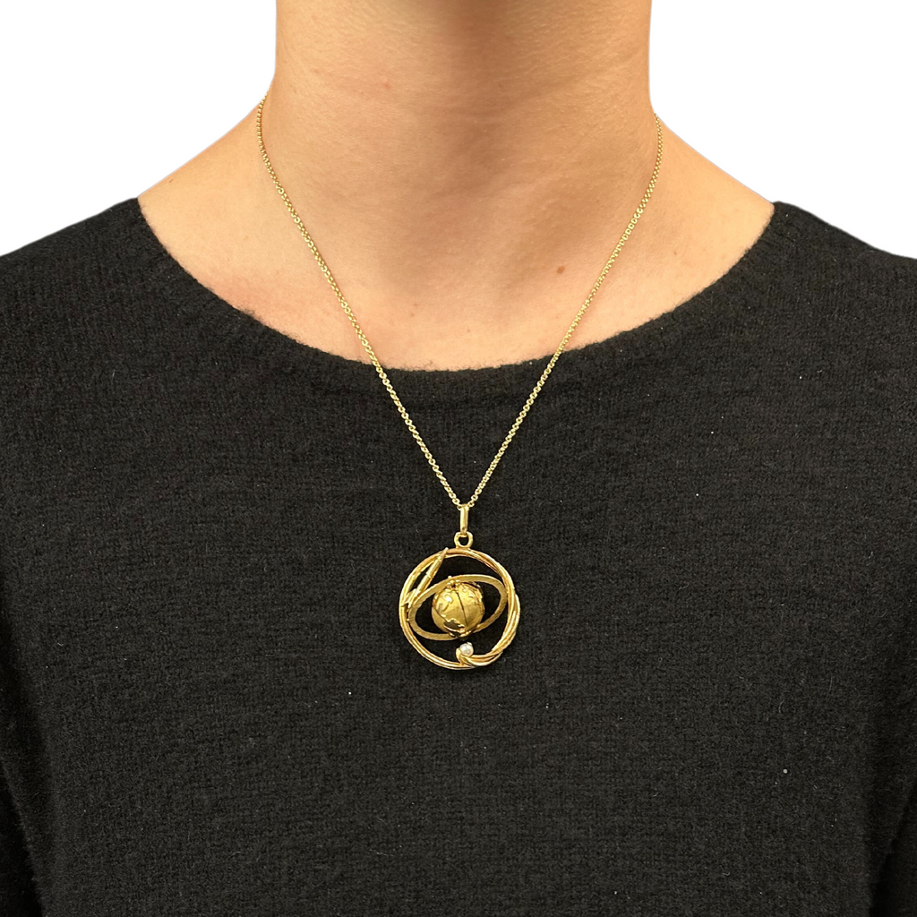 This vintage French charm pendant in 18 karat yellow gold has a globe inside the two rings that opens to reveal the Eiffel Tower.