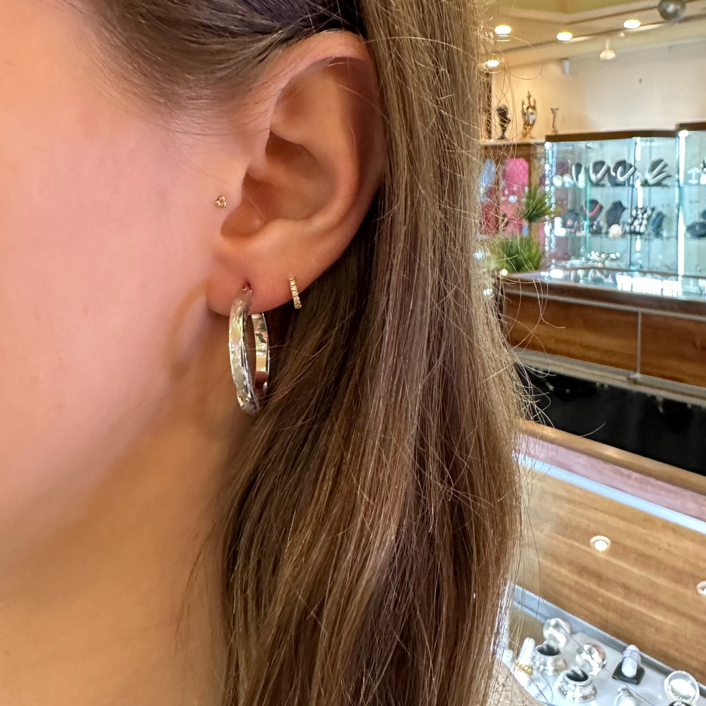 One pair of simple 14K white gold round hoop earrings featuring an etched design motif.