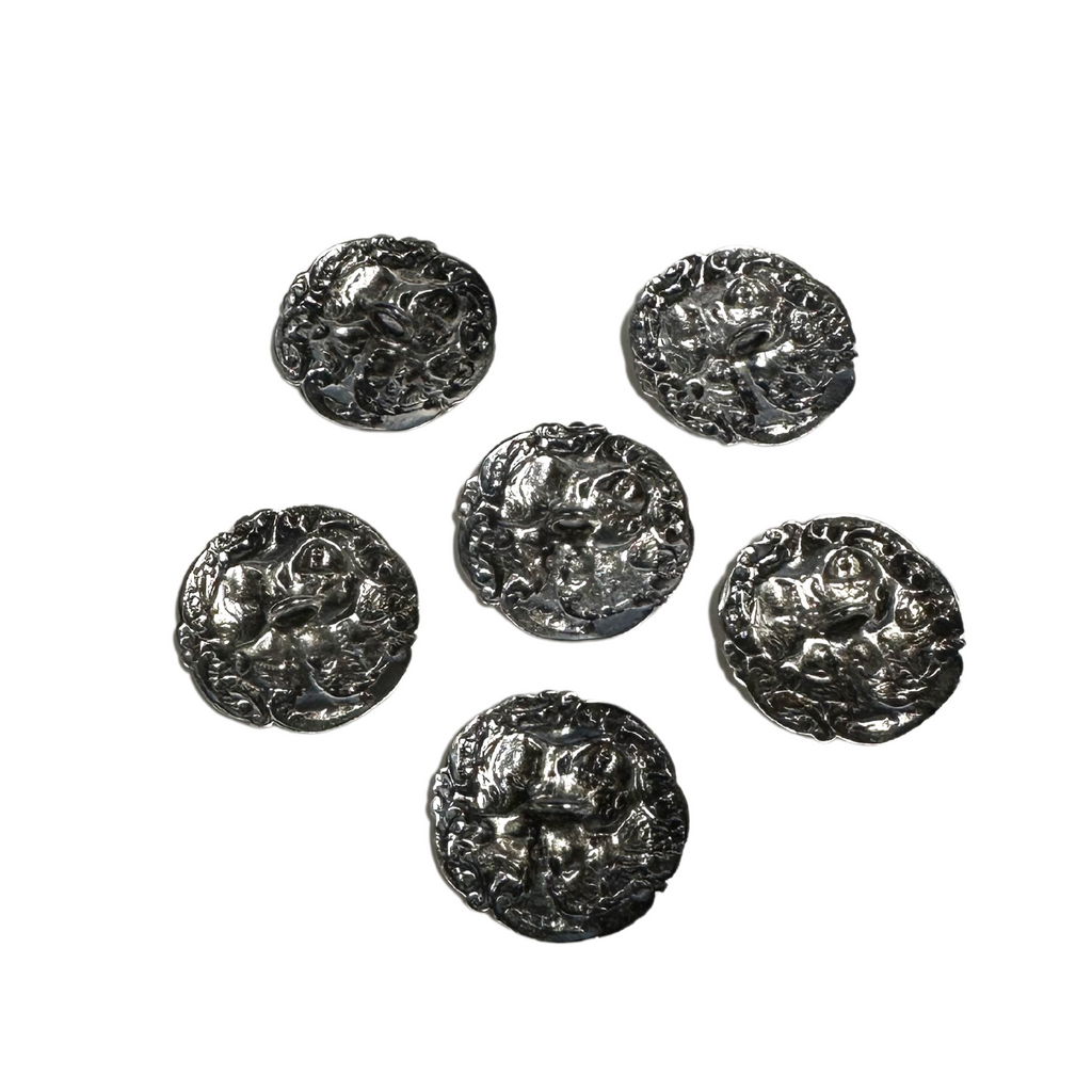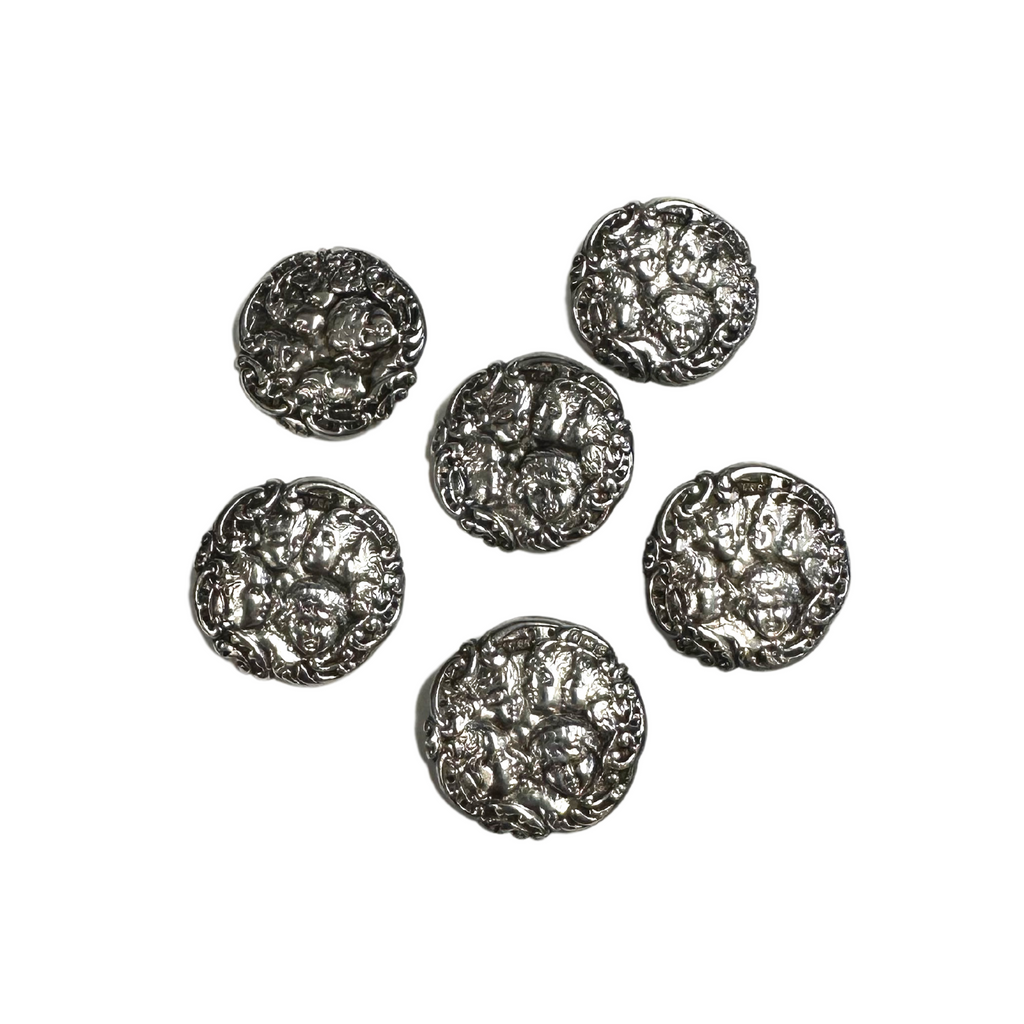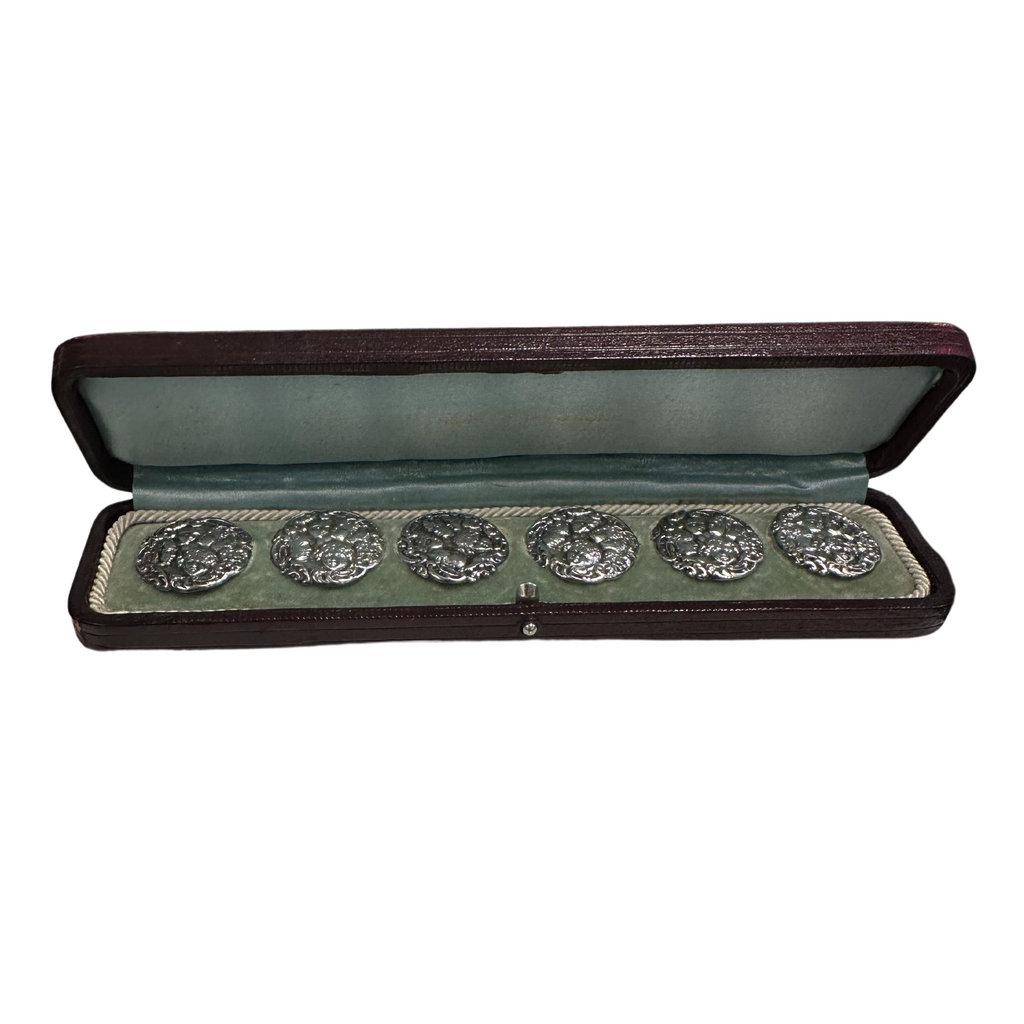 They don't make them quite like this anymore. Set of six round quarter shank sterling silver buttons featuring a group of chubby cherubs done in the repousse technique. Comes in the original Henry Birks & Sons maroon leather box. These buttons were made in Birmingham England by, Levi & Salaman for Birks.