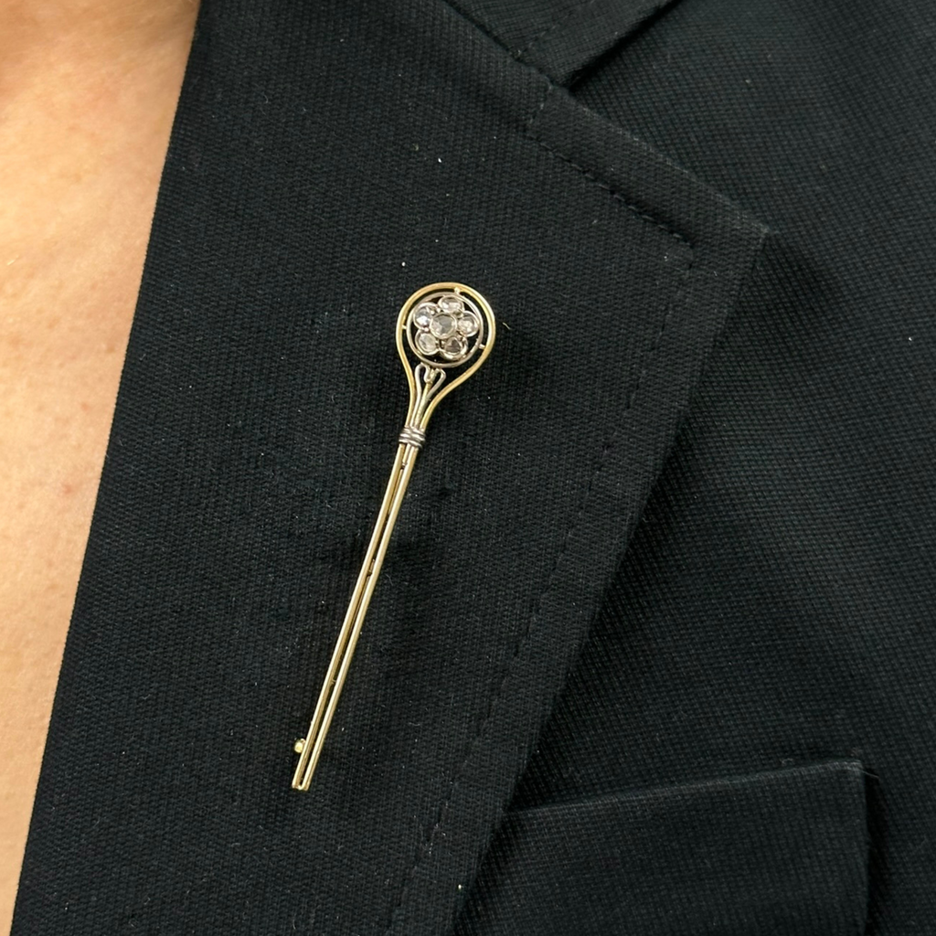 Give your blazer a make-over with this stunning 18k yellow gold and silver antique stickpin. Six rose cut diamonds set in silver, adorn the top of this piece adding the perfect touch of glam to your outfit. This piece features delicate milgrain edging and openwork. This pin can be worn alone, or clustered with favorites from your collection.