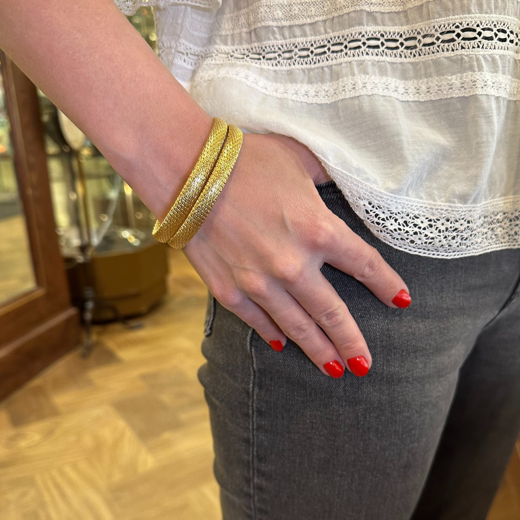 Chic French 18k yellow gold round flexible woven link bangle bracelet that attach with a push clasp. There are two available.