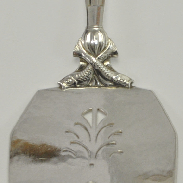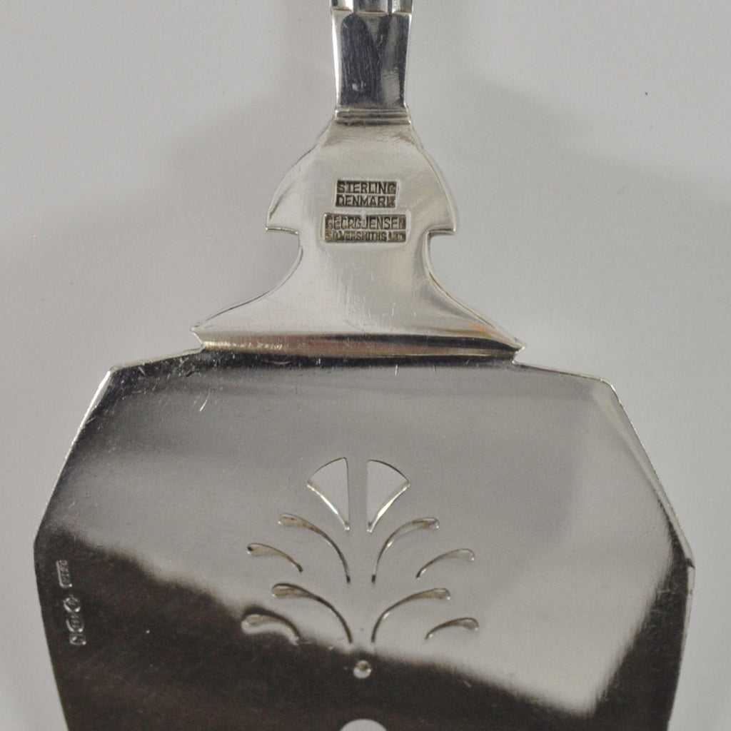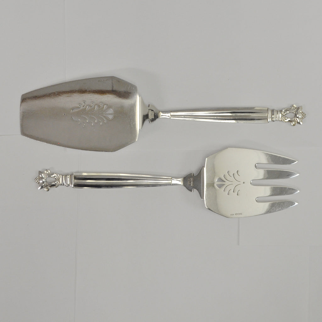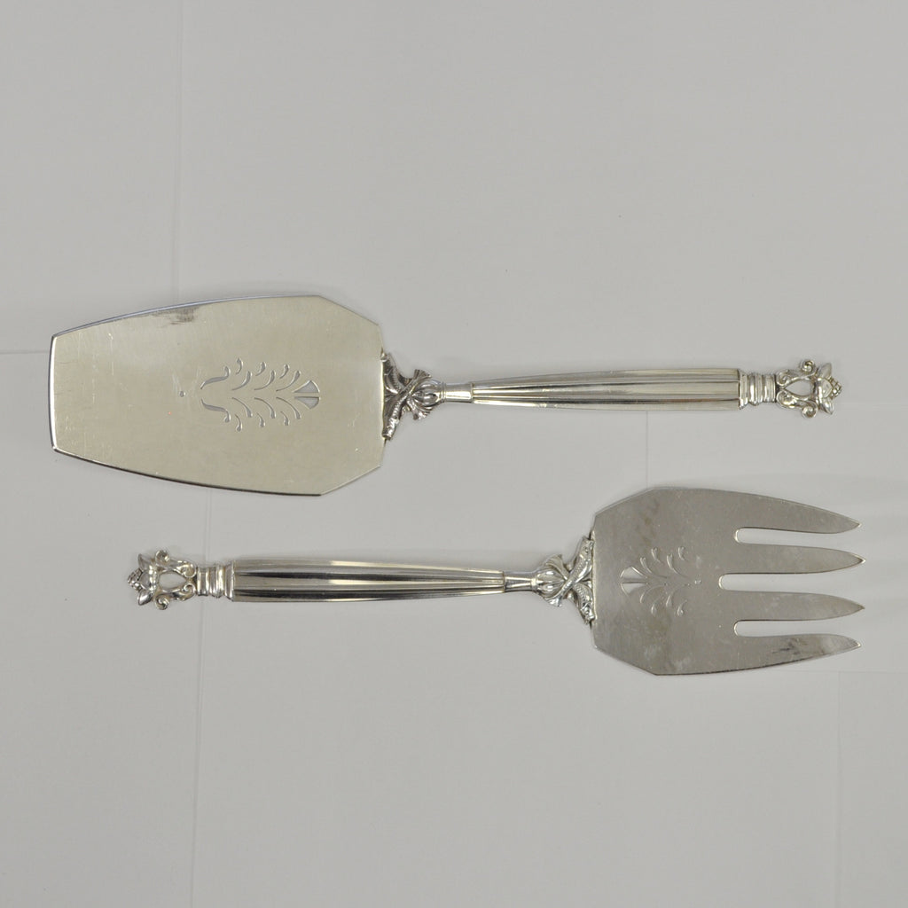 Georg Jensen sterling silver acorn fish serving set from mid 20th century. Design #62 by Johan Rohde from 1915.