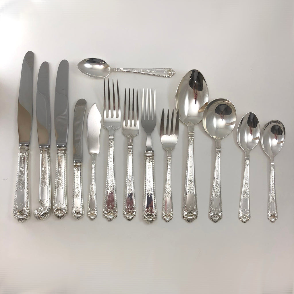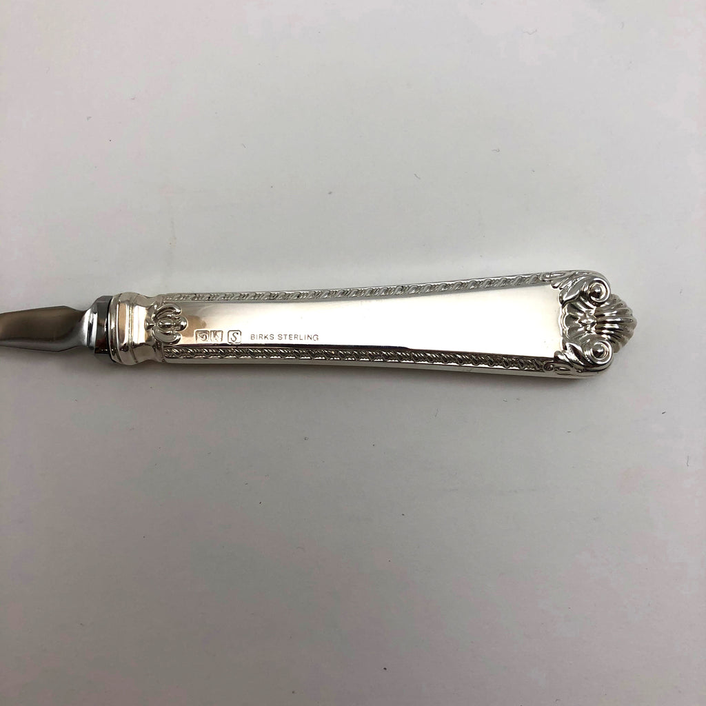 Henry Birks and sons George II Engraved Pattern is one of the most distinct patterns in silver flatware. The pieces themselves are significantly heavier than the average and each piece is hand engraved to perfection.