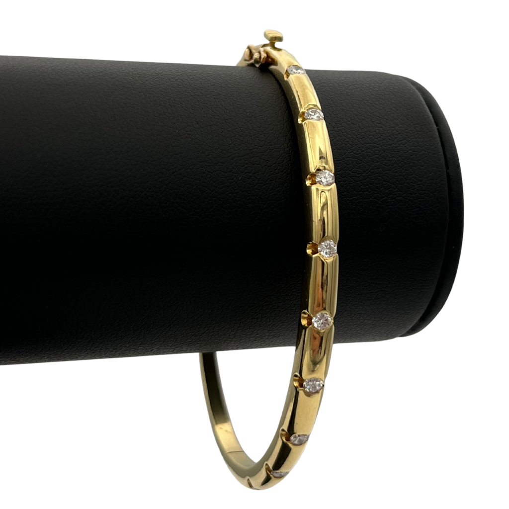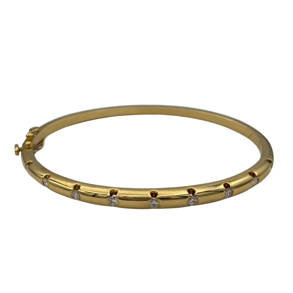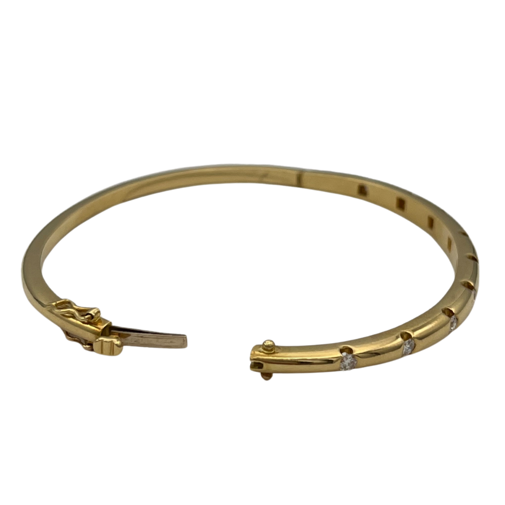 A unique vintage high polish18k yellow gold and open semi-bezel set diamond oval hinge bracelet with push clasp and two figure eight safety links.