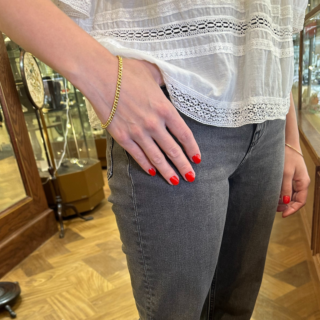 Vintage bright and gleaming solid 18k yellow gold curb link bracelet. Bracelet attaches with a push clasp and has one safety chain measuring 1 1/4 inches.