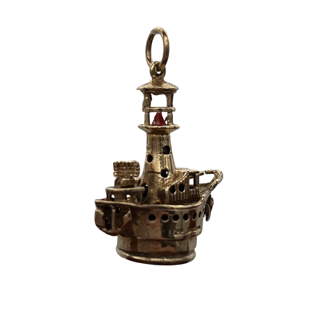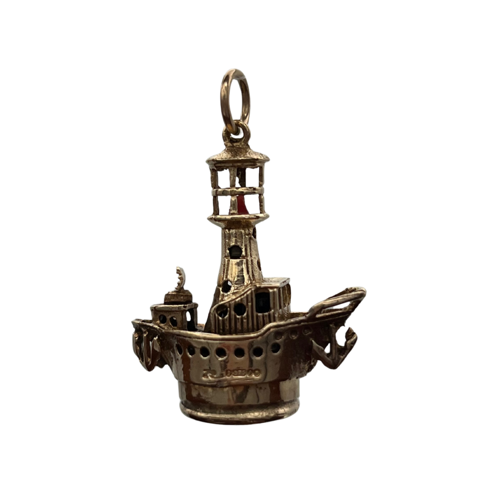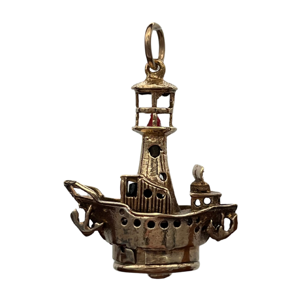 Vintage 9k yellow gold lightship pendant with a working battery-operated light in the tower.