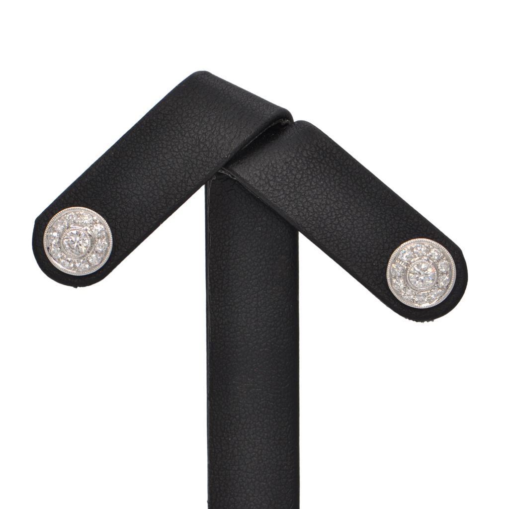 Secondary Diamonds: each earring has a halo of ten (10) pavé set, round brilliant cut diamonds measuring approximately 1.5mm each in diameter with an estimated SI clarity, estimated G/H color, and estimated 0.15ct diamond weight, the total secondary diamond weight is 0.30ct.