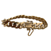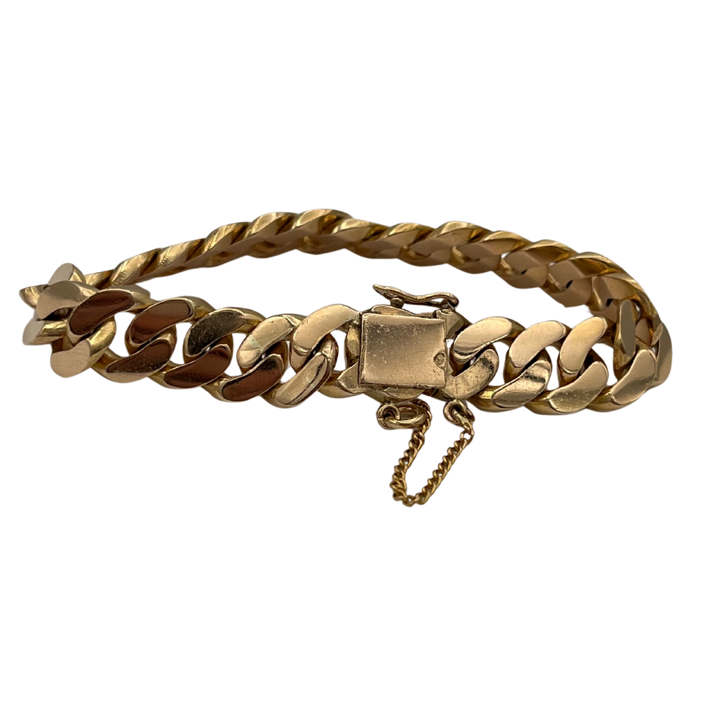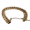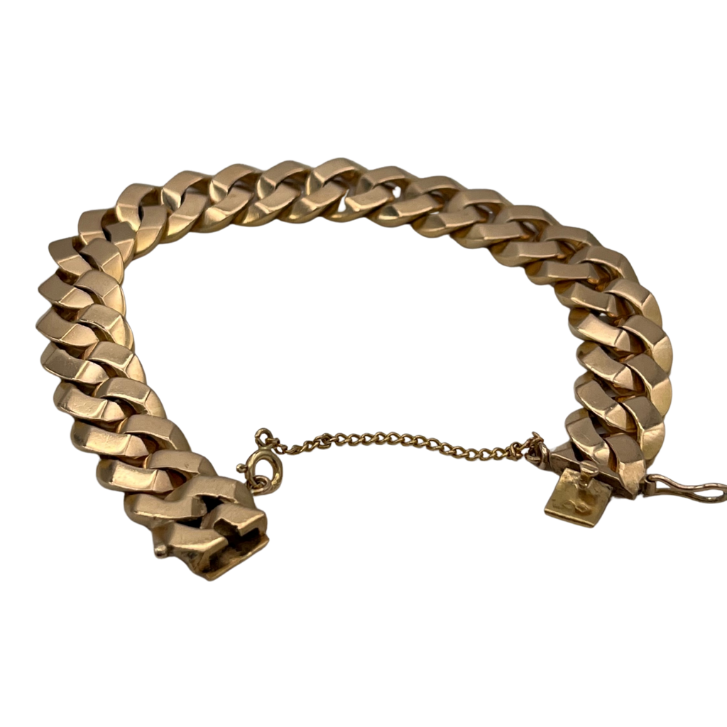 Vintage 18k rose gold 11.0mm curb link chain bracelet with a push clasp and detachable safety chain.