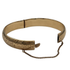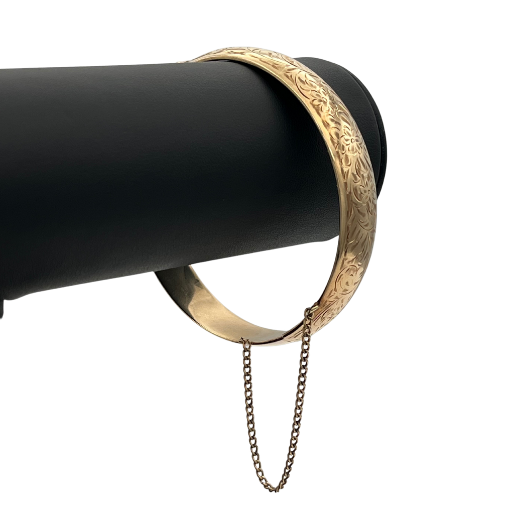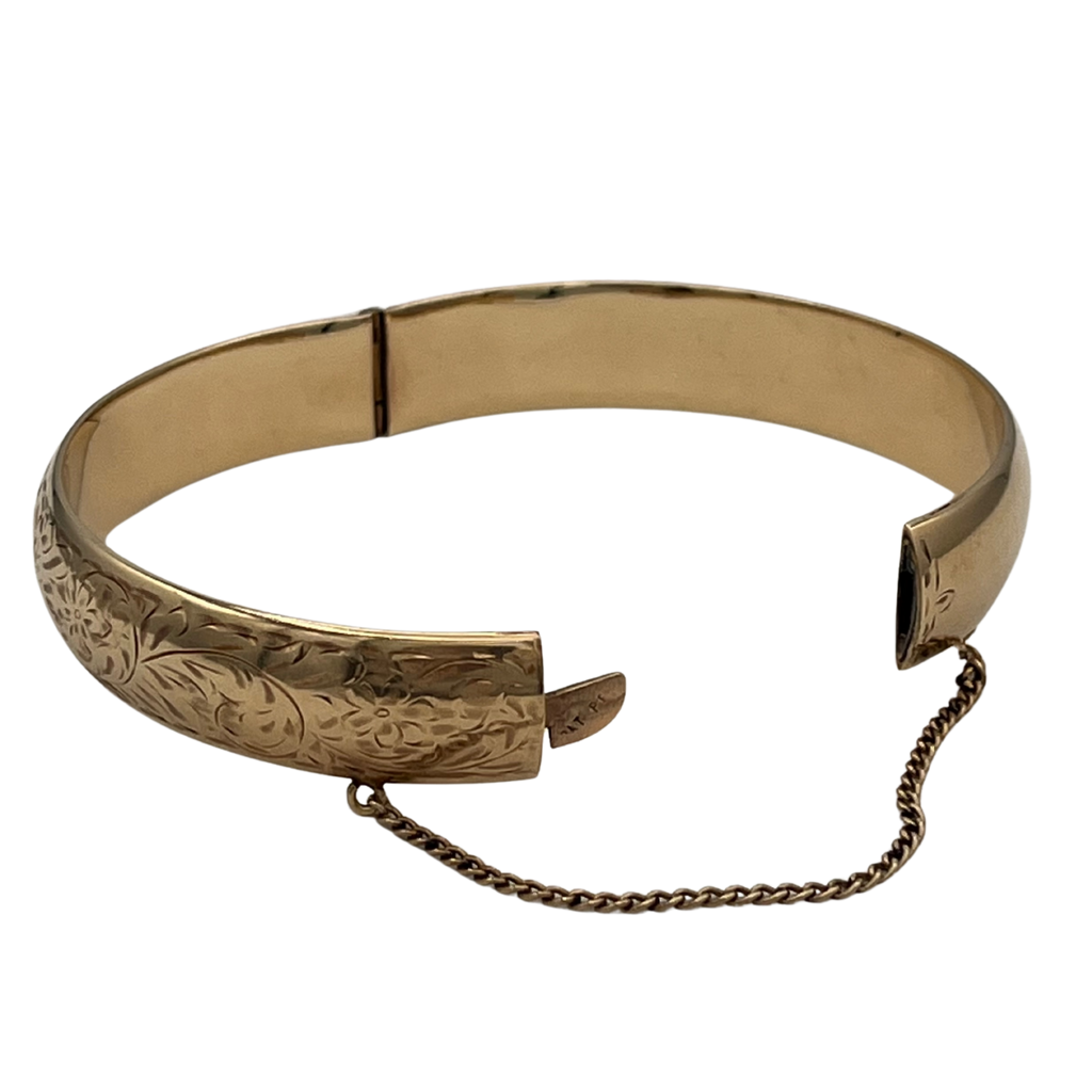 Vintage 10k yellow gold hinged bangle bracelet hand engraved with a flower and vine motif. The bracelet fastens with a push clasp and has a safety chain.