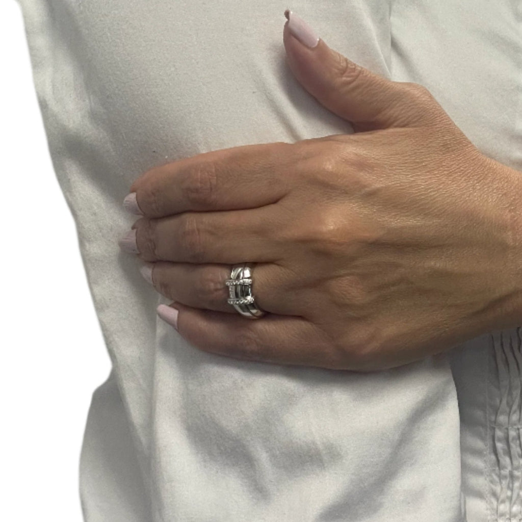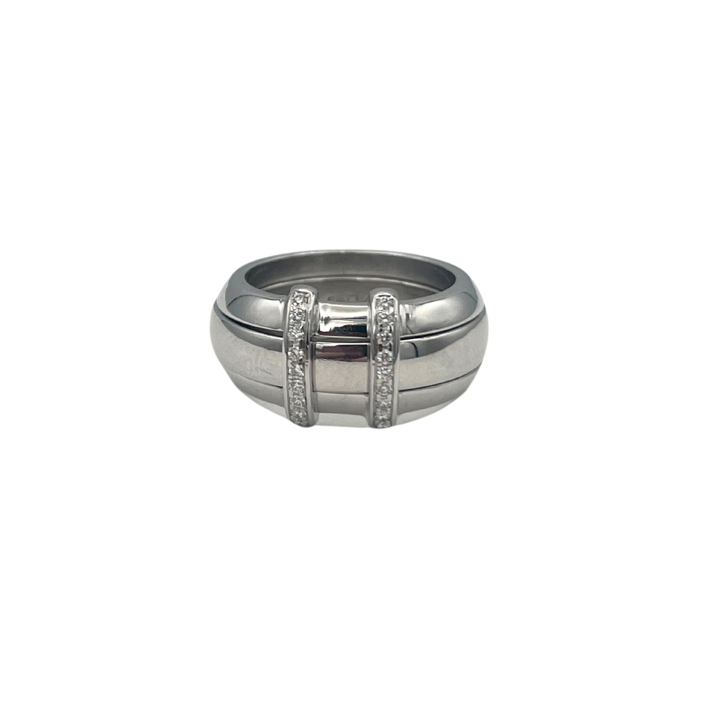 A wonderfully made diamond ring by renown watch maker Omega. The center gold band is removable and fits seemless between the gap in the diamond ring.