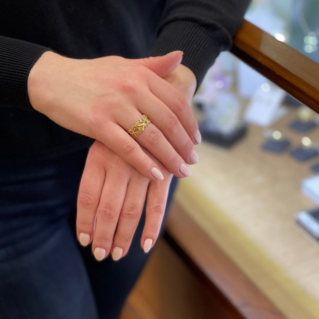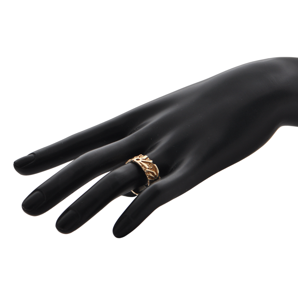 Vintage solid 10k yellow gold ring featuring a geometric high polish and textured motif.
